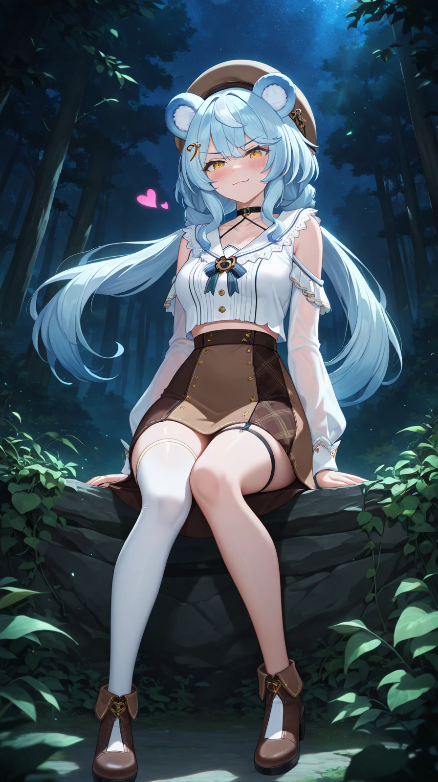 Rei, light blue hair, long hair, twin tails, gold eyes, bear ears, hair ornaments, black choker, cross neck strap, navy capelet, white frilled trim, bow, gold chain decor, white crop top, shoulder cut-out, white long sleeves, see-through sleeves, brown asymmetrical skirt, plaid skirt, patterned skirt, black garter strap, single thighhigh, white thighhigh, brown beret