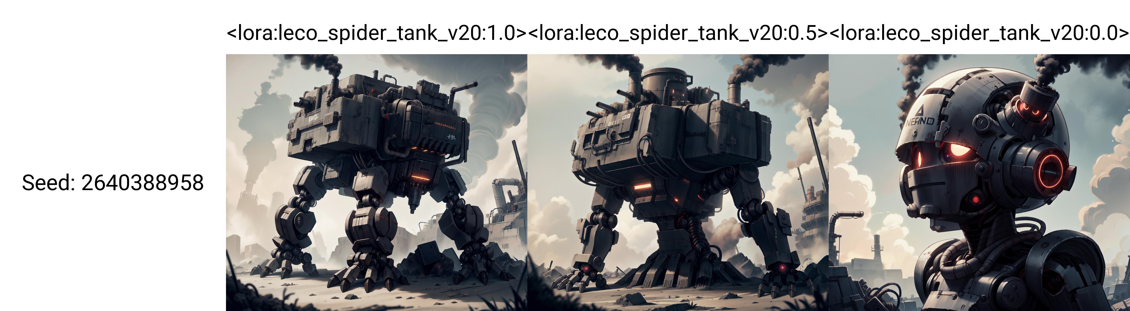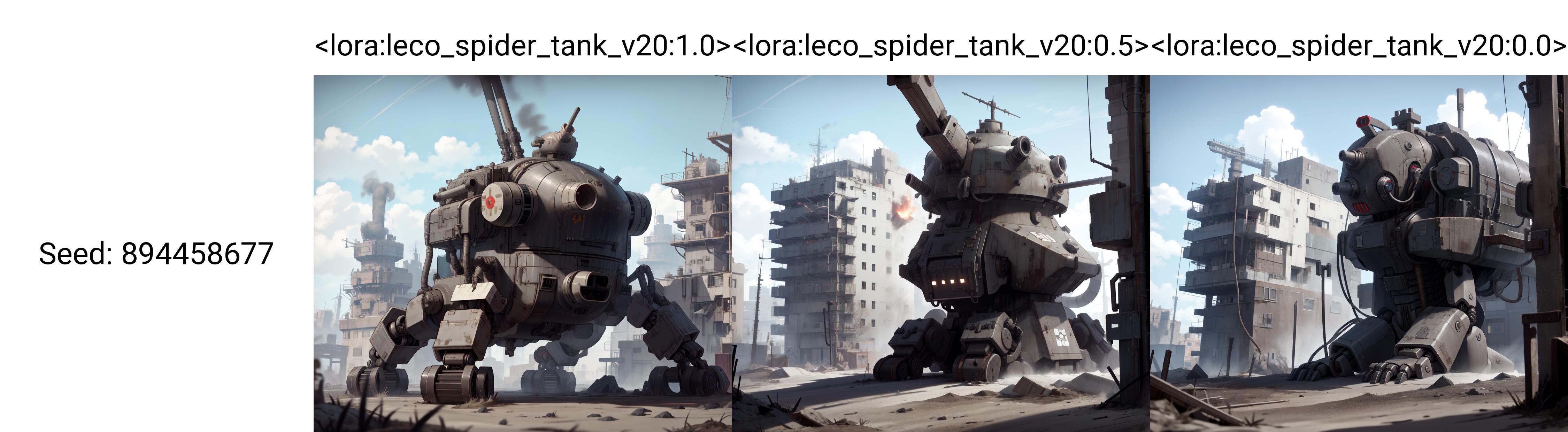 The tag "non-humanoid robot" has a wide range of meanings, and the purpose of this LoRA is to increase the probability of a multi-legged tank-type robot using LECO.