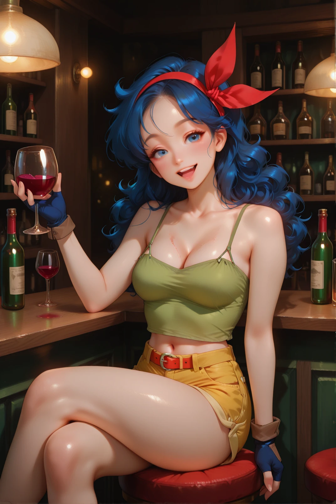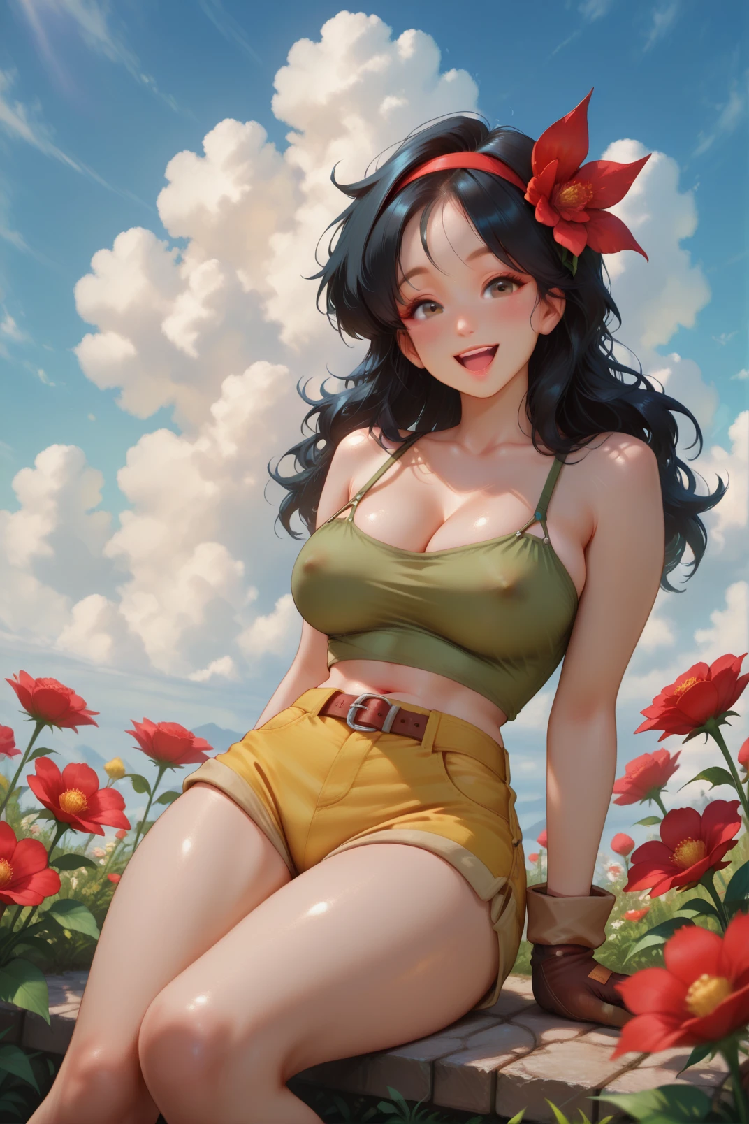 illaunch a, 1girl, green tank top, breasts, yellow shorts, shorts, solo, gloves, crop top, cleavage, long hair, large breasts, looking at viewer, navel, black hair, smile, outdoors, belt, open mouth, sitting, midriff, tank top, brown gloves, red flower, sky, flower, short shorts, day, bare shoulders, hairband, blue sky, thighs, cloud, covered ???????, feet out of frame, collarbone, upper teeth only<lora:illustrious Launch 768x1152:1>, garden