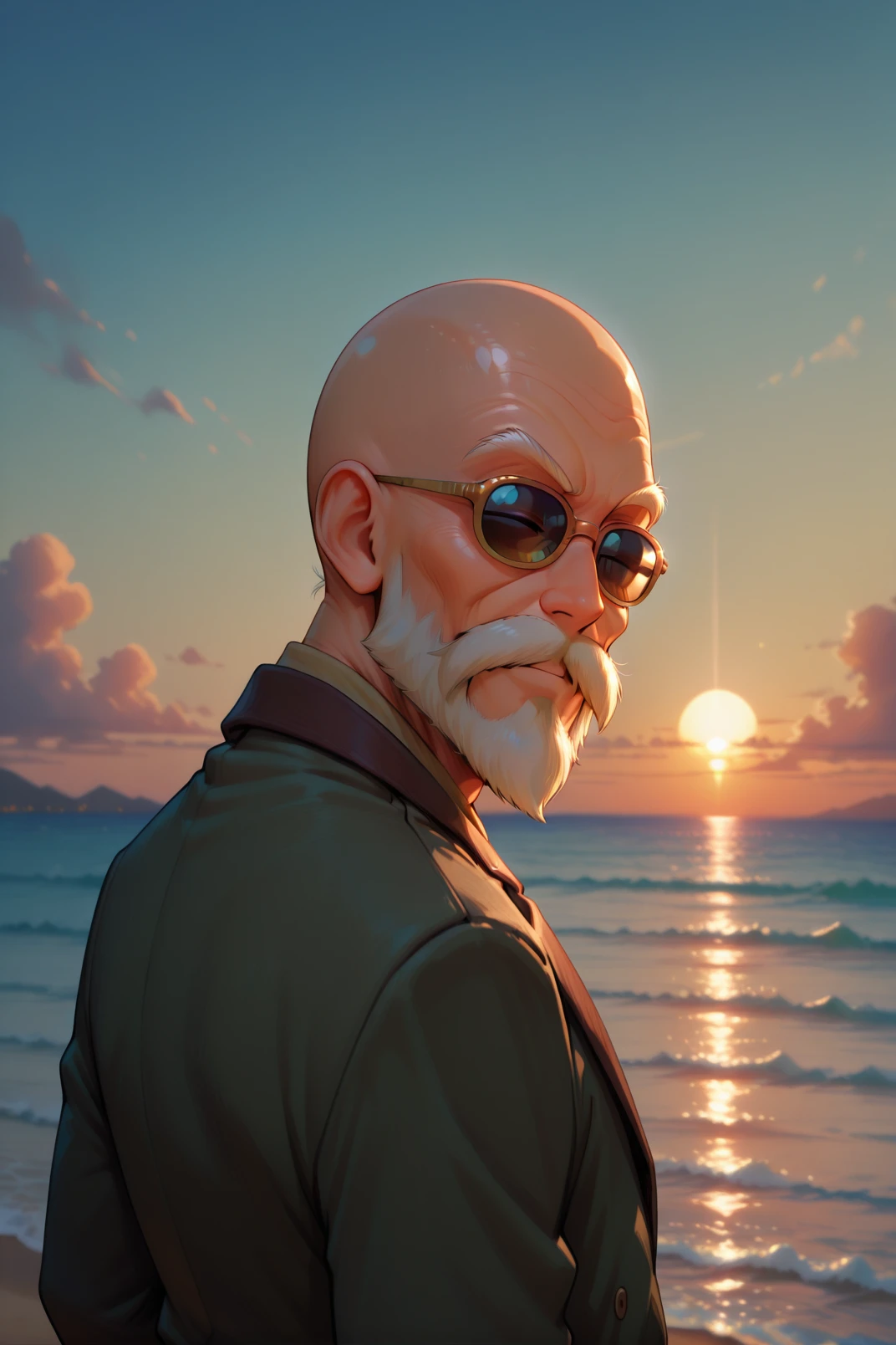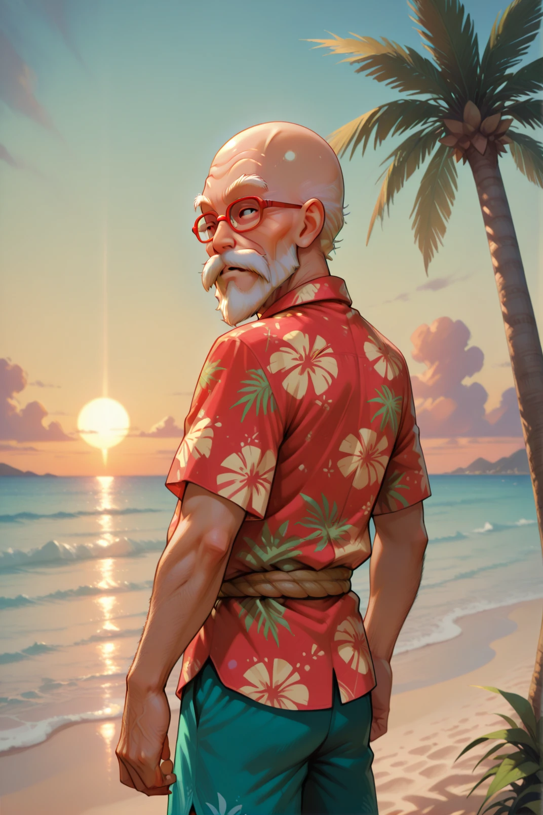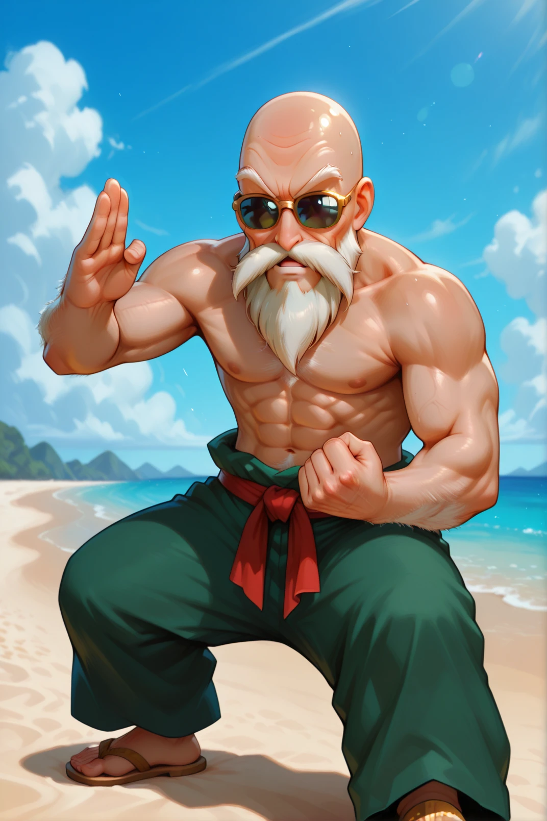 master roshi, 1boy, male focus, muscular, solo, muscular male, facial hair, abs, old man, pectorals, bara, ??????? male, bald, old, beard, sunglasses, ???????, outdoors, mustache, beach, large pectorals, arms behind back, veins, japanese clothes, navel, thighs, chest hair, feet out of frame, mature male, navel hair, pelvic curtain, loincloth, fundoshi, day, bulge, blurry background, stomach<lora:illustrious Launch 768x1152:1>