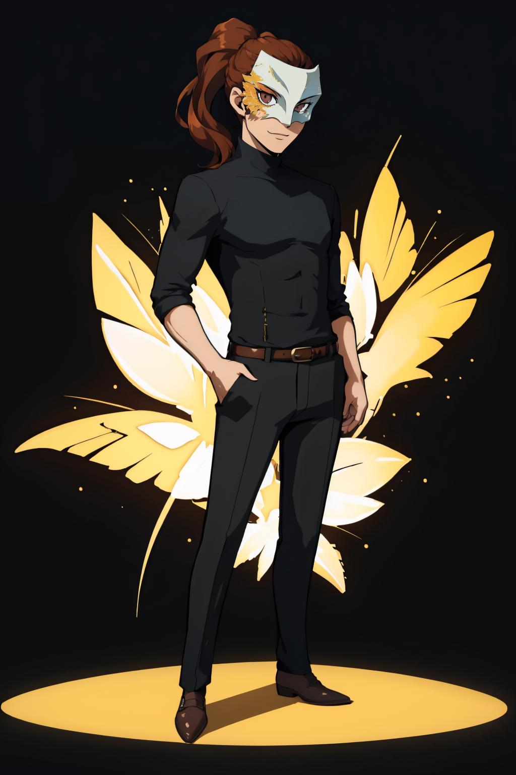 philemon2, mask, ponytail, brown hair, turtleneck, pants, shoes