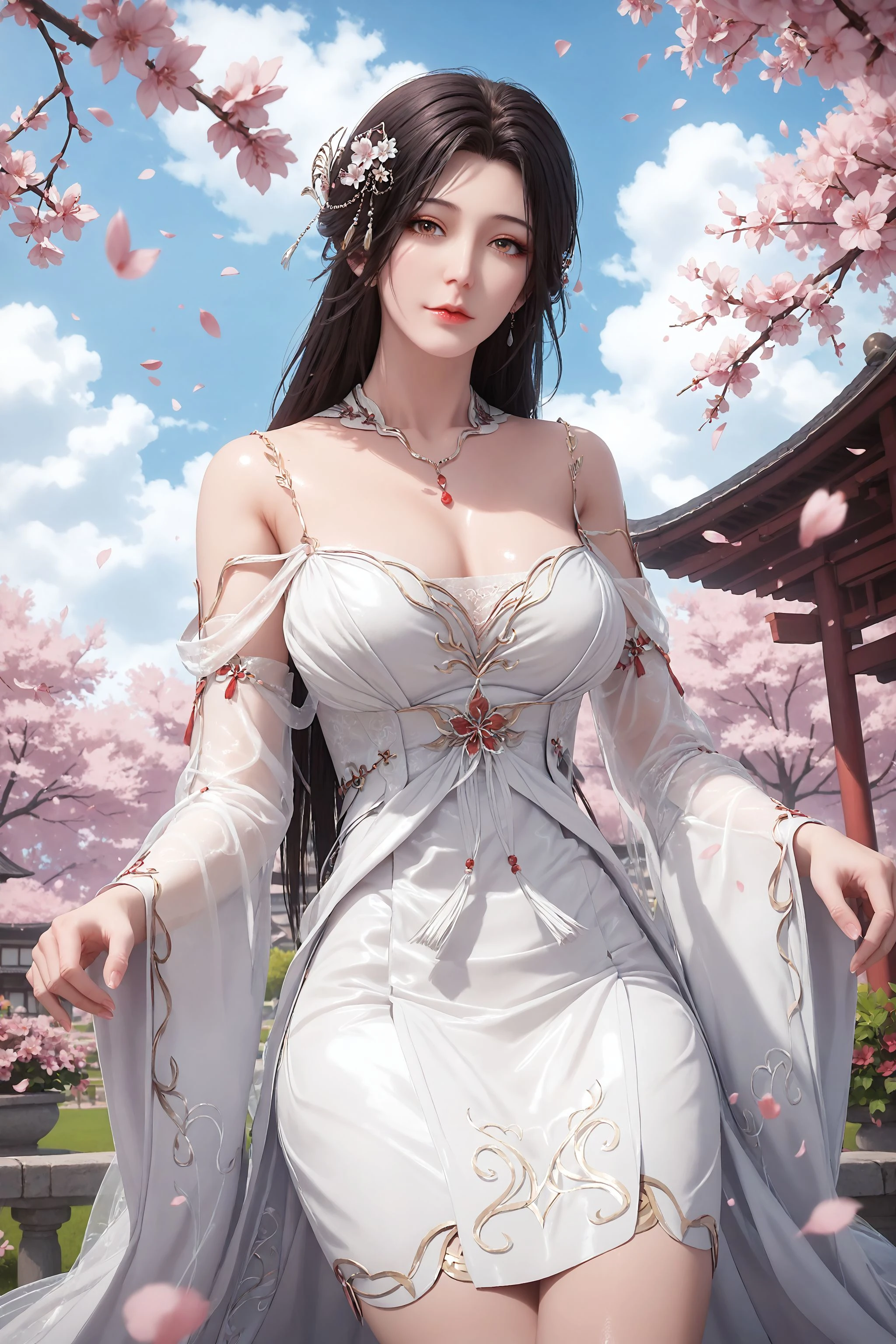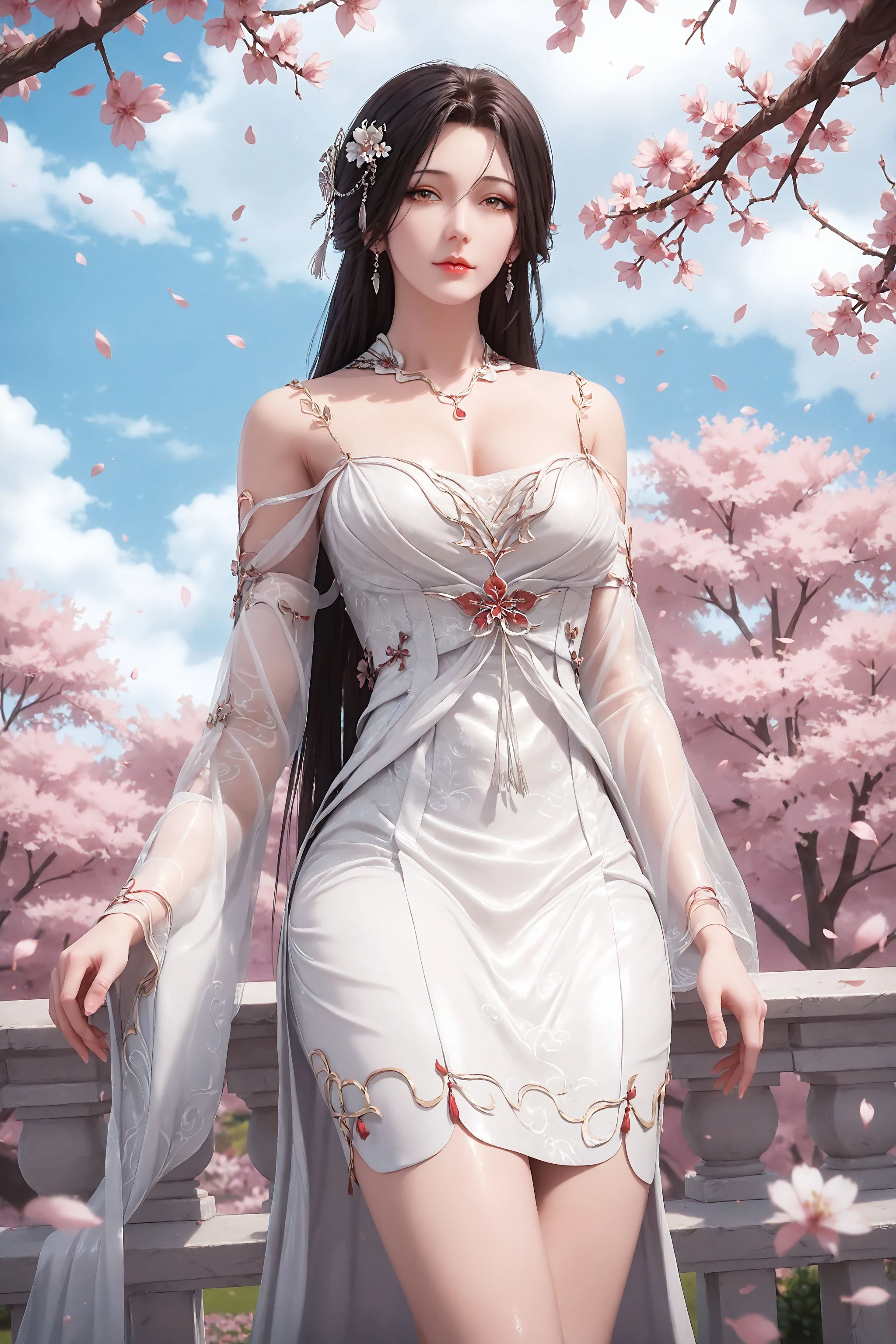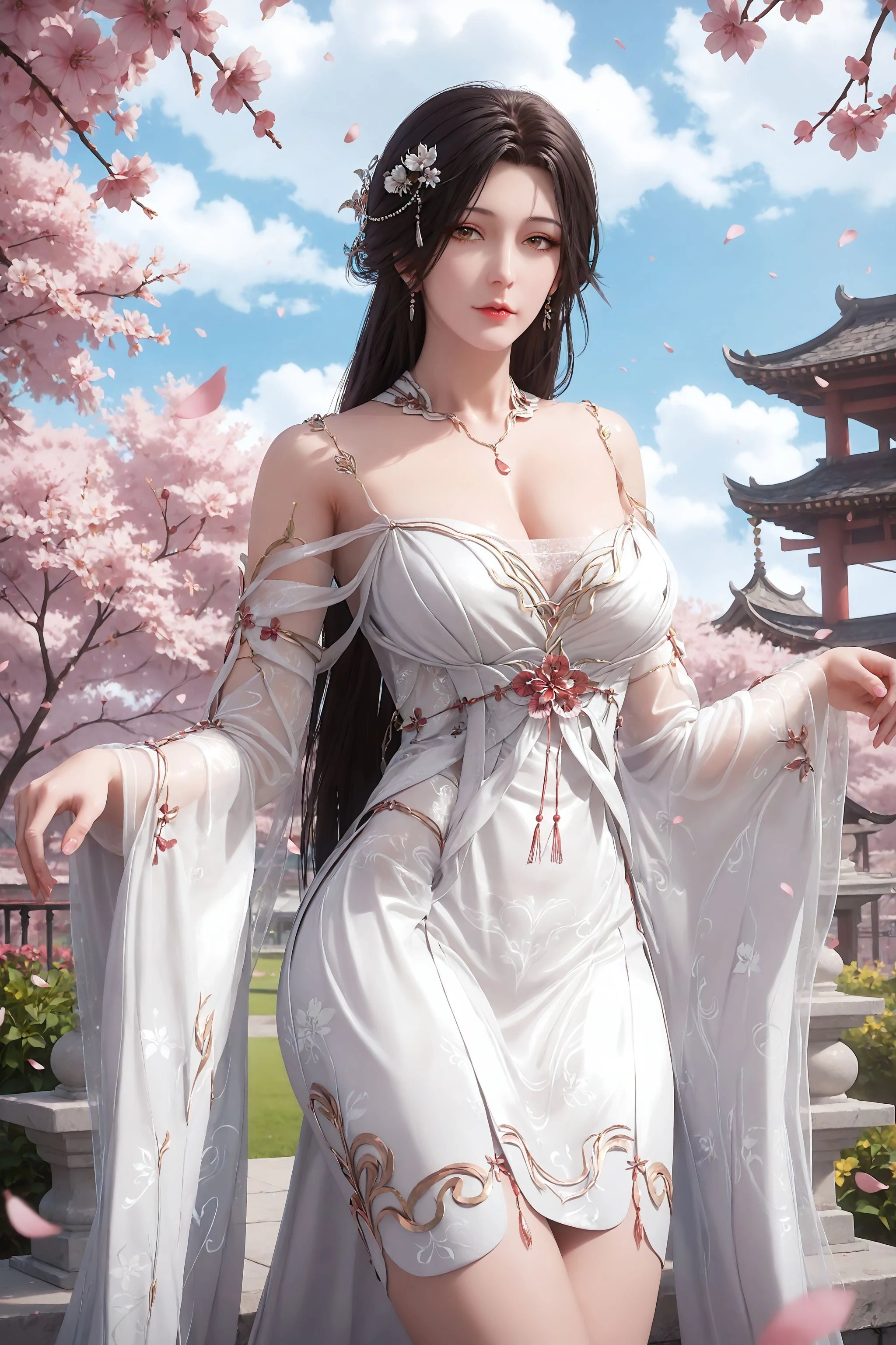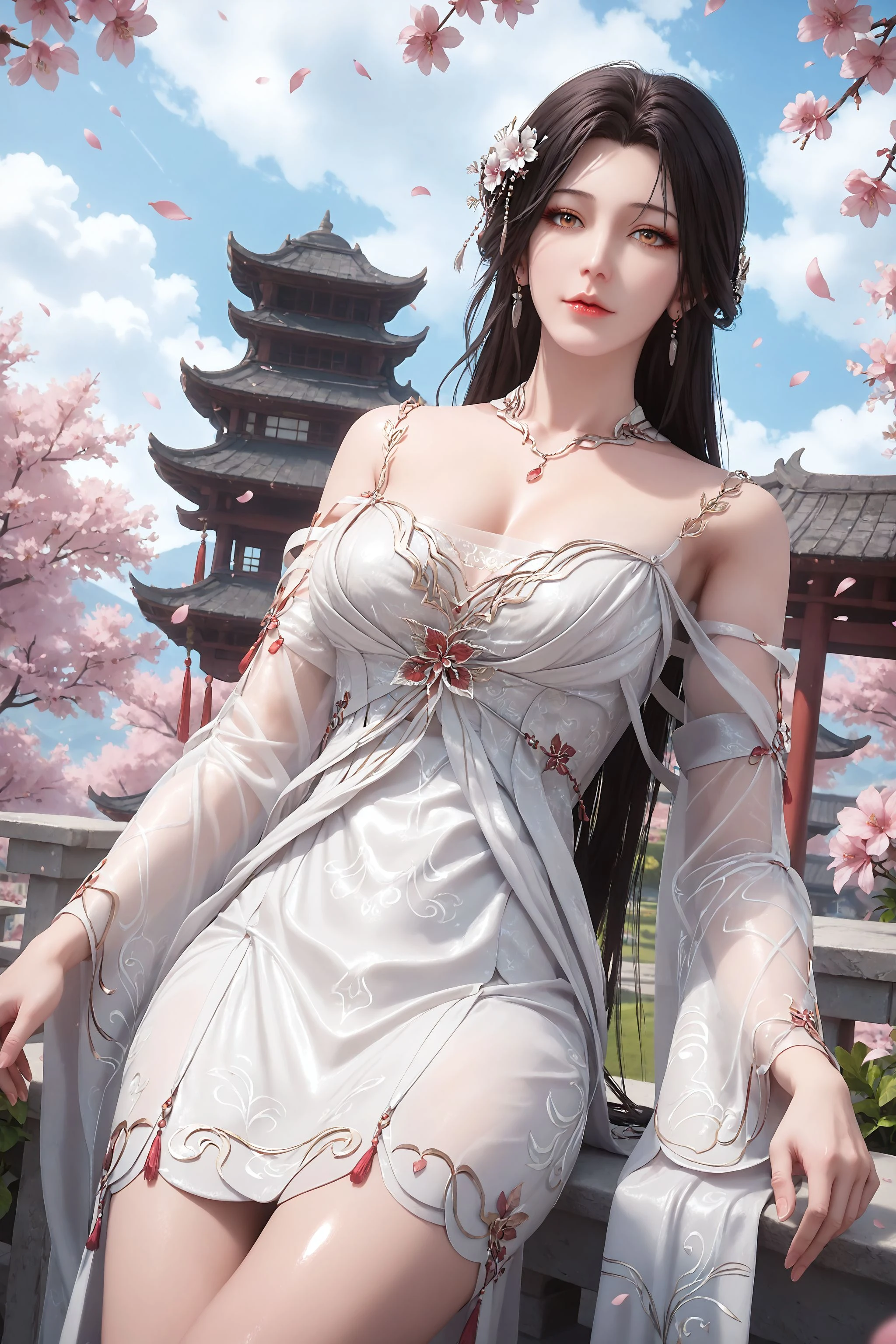 1girl, dress, long hair, solo, bare legs, white dress, hair ornament, black hair, jewelry, detached sleeves, bare shoulders, necklace