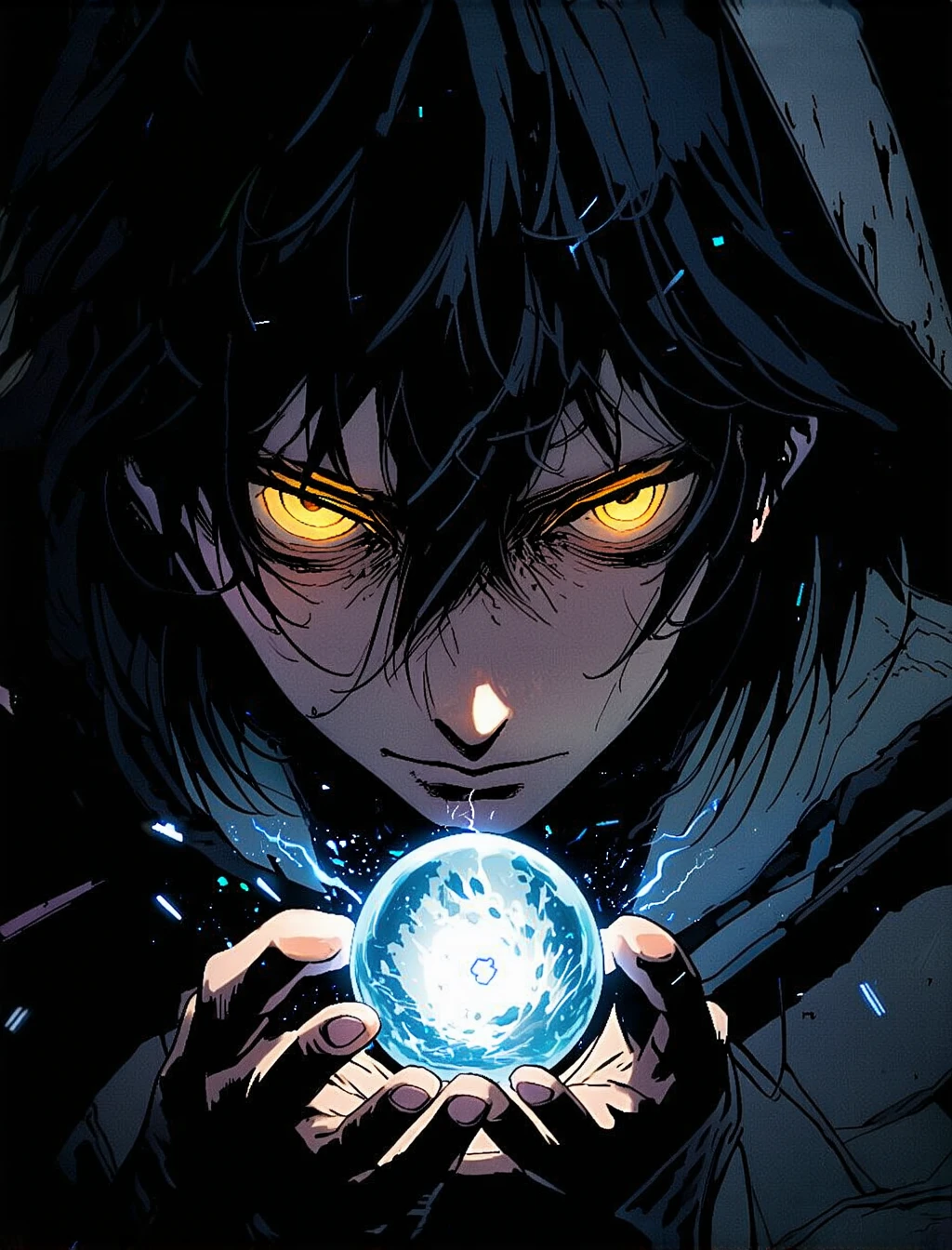 A hooded man with black hair, head down, revealing golden swirling eyes in front of the black background, bust, one hand holding a luminous magic ball, scattering magic particles, gray and blue picture atmosphere, bringing a sense of mystery