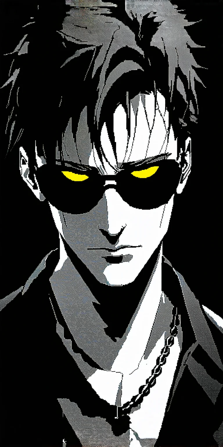 black light style, A man wearing sunglasses, yellow eyes, wearing a necklace, staring down, the whole picture is black, the face has a clear edge light