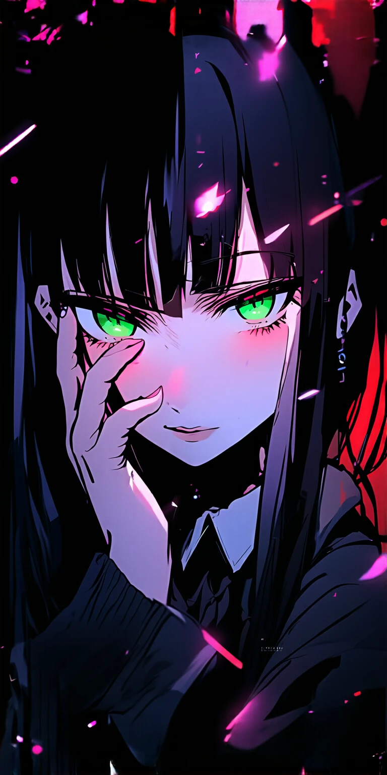 black light style, Miku Hatsone uses a cool pose in the picture, a hand touches her face, her green eyes sparkle, and flash particles float in the air. The whole picture is dark, presenting a mysterious, red-purple atmosphere