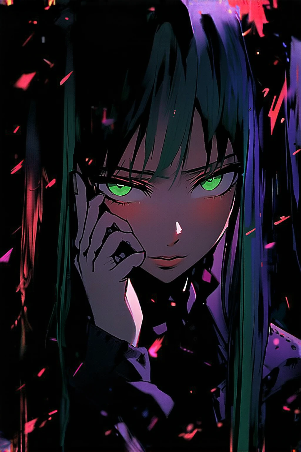 Black lighting style, Miku Hatsone used a cool pose in the photo, a hand touching her face, her green eyes glinting, and flashing particles floating in the air. The green double ponytail hangs down, the whole painting is dark, showing a mysterious red and purple atmosphere