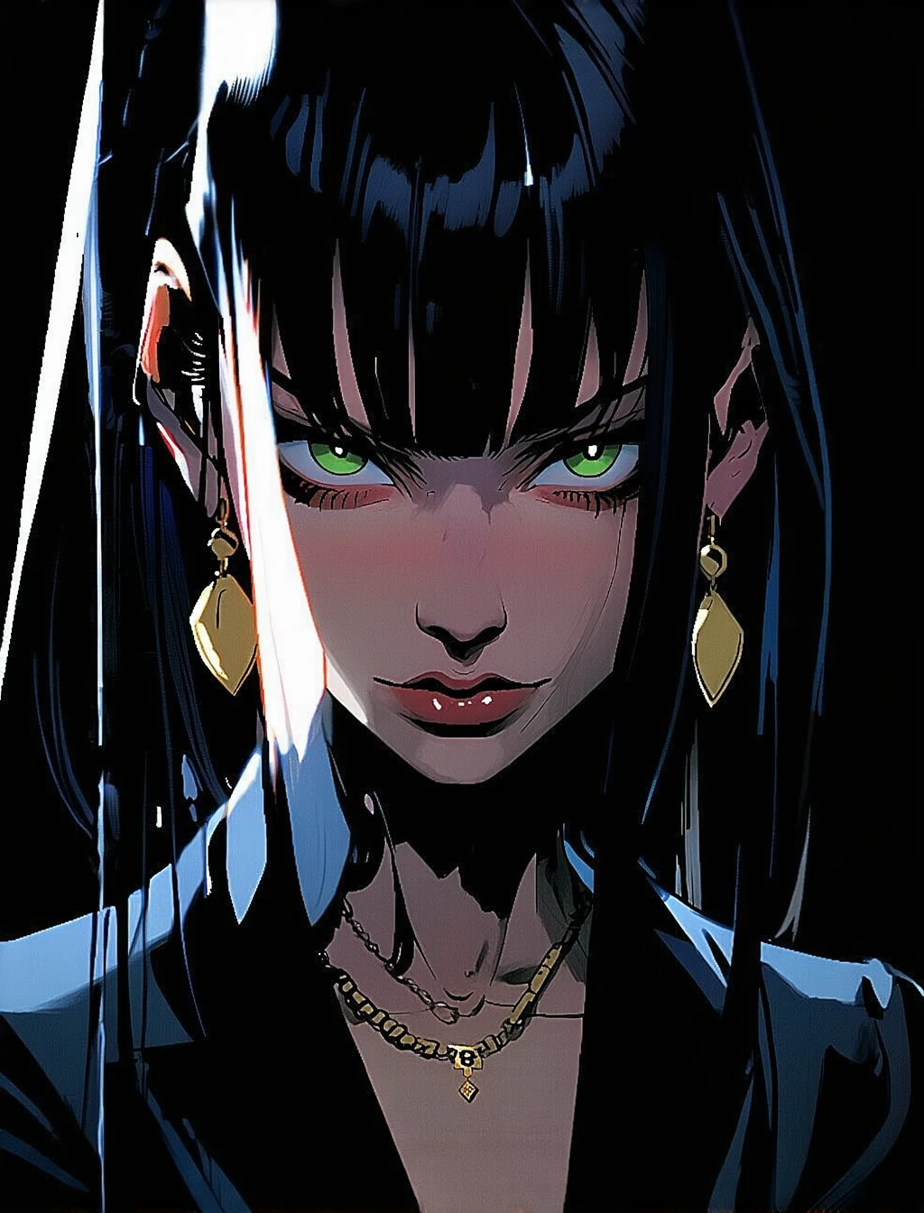 A woman with black hair, green eyes, leaking flowing light, in front of a black background, bust, she wears a suit, necklace, gold earrings, only eyes have color