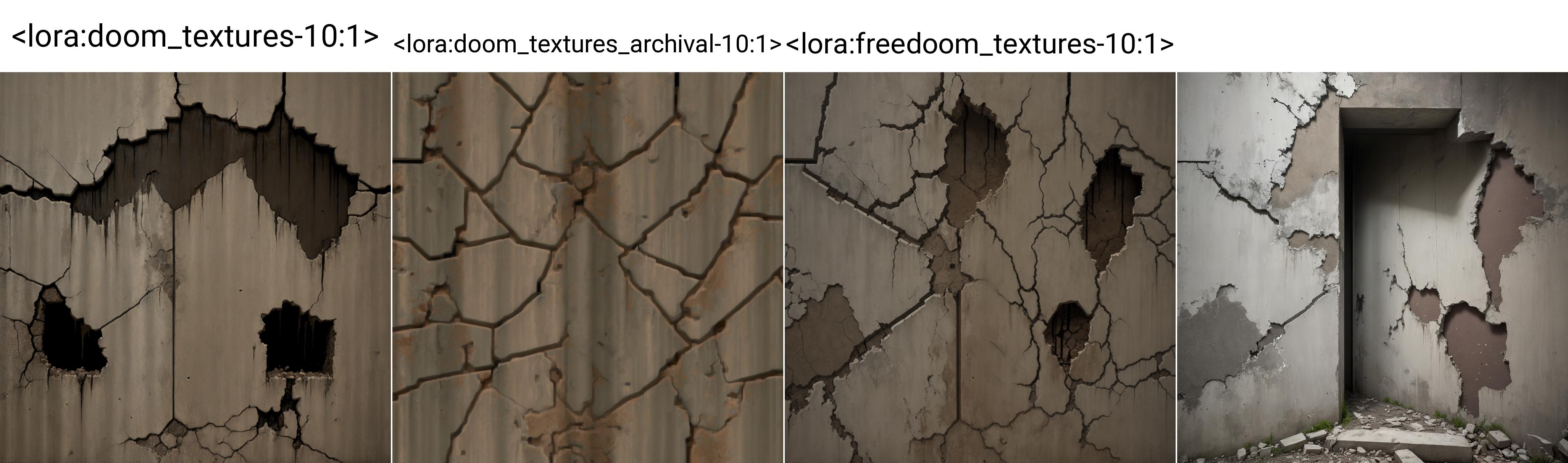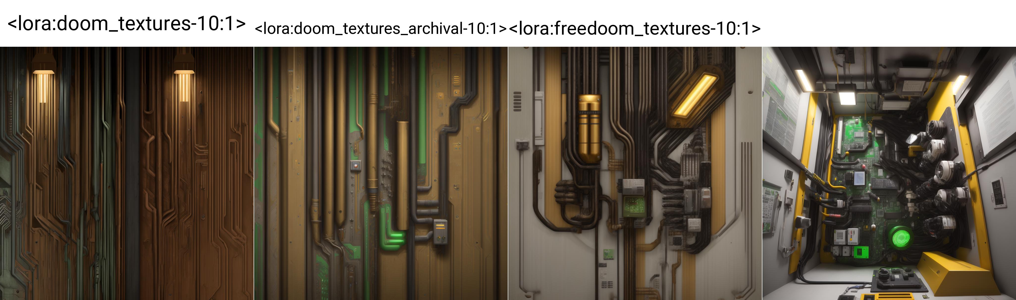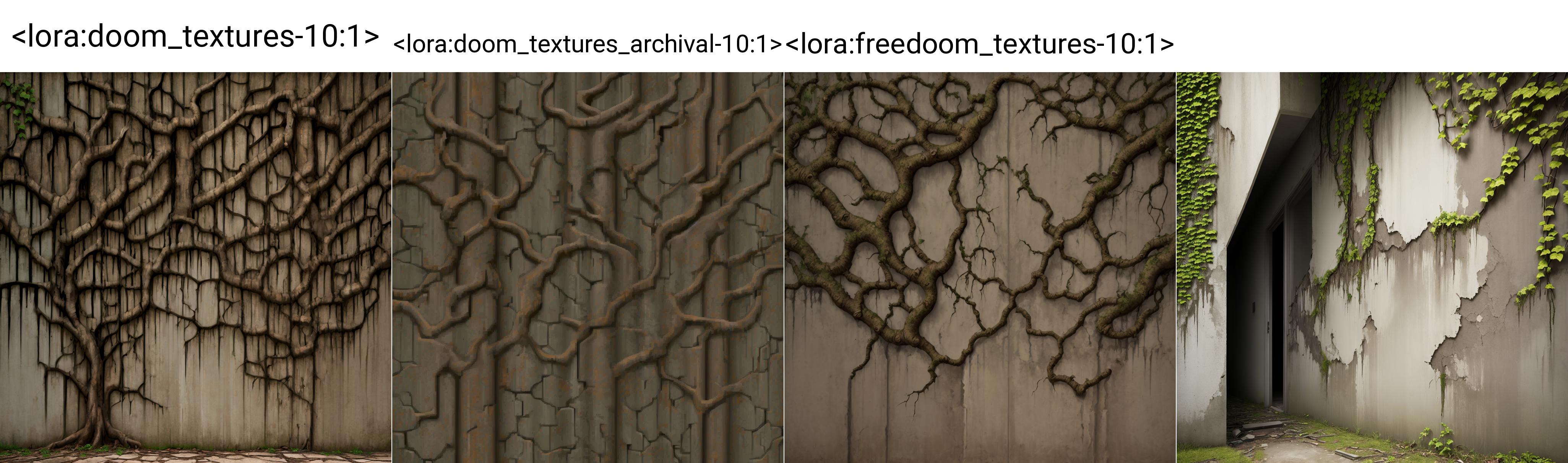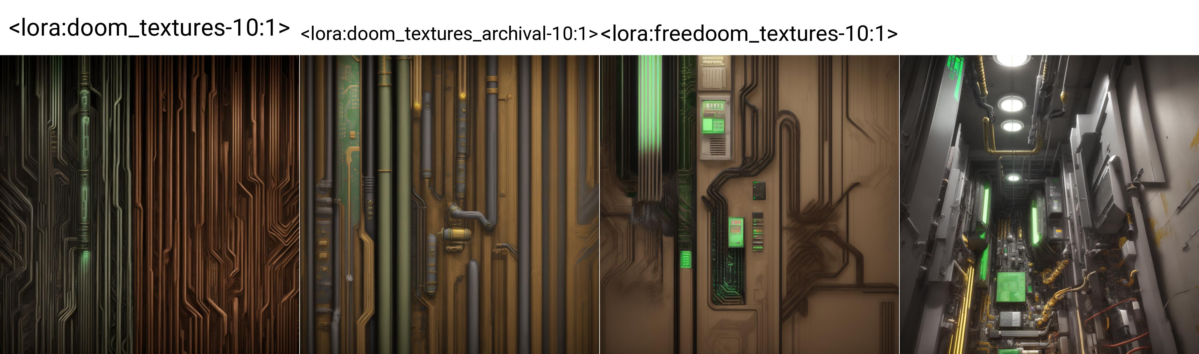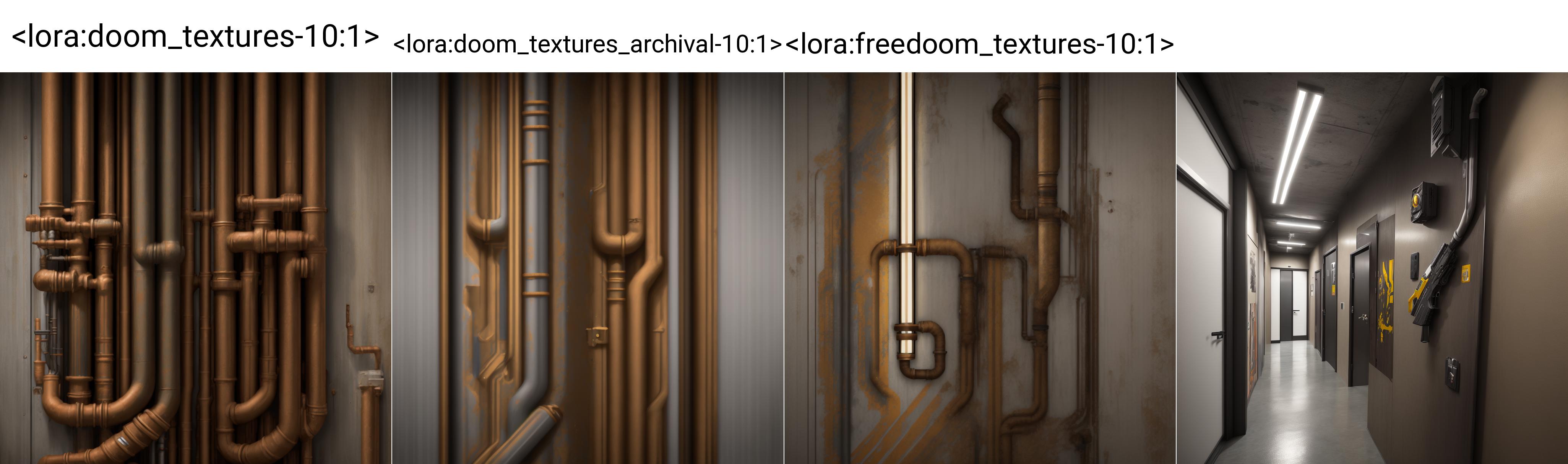 Doom and FreeDoom are trained on doom and freedoom textures with same tags but obviously, in case of freedoom - textures from freedoom used as stand-ins for doom textures. The resulting LoRAs came out a bit weaker, so for better results with strong-styled checkpoints (such as revanimated) you'll need to use power between 1 and 1.5.