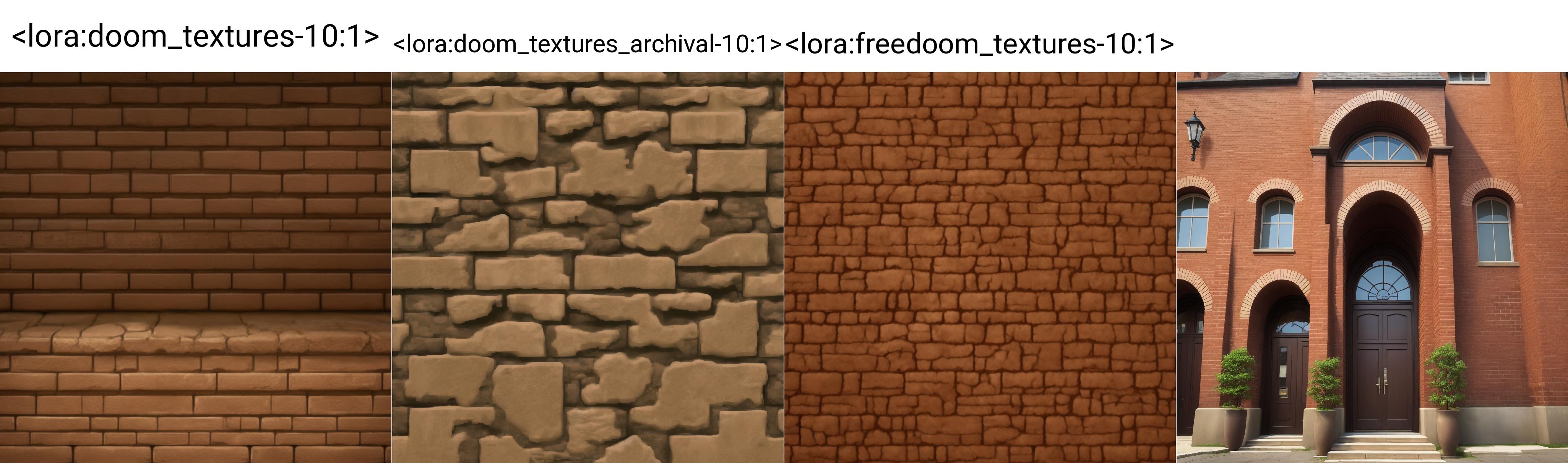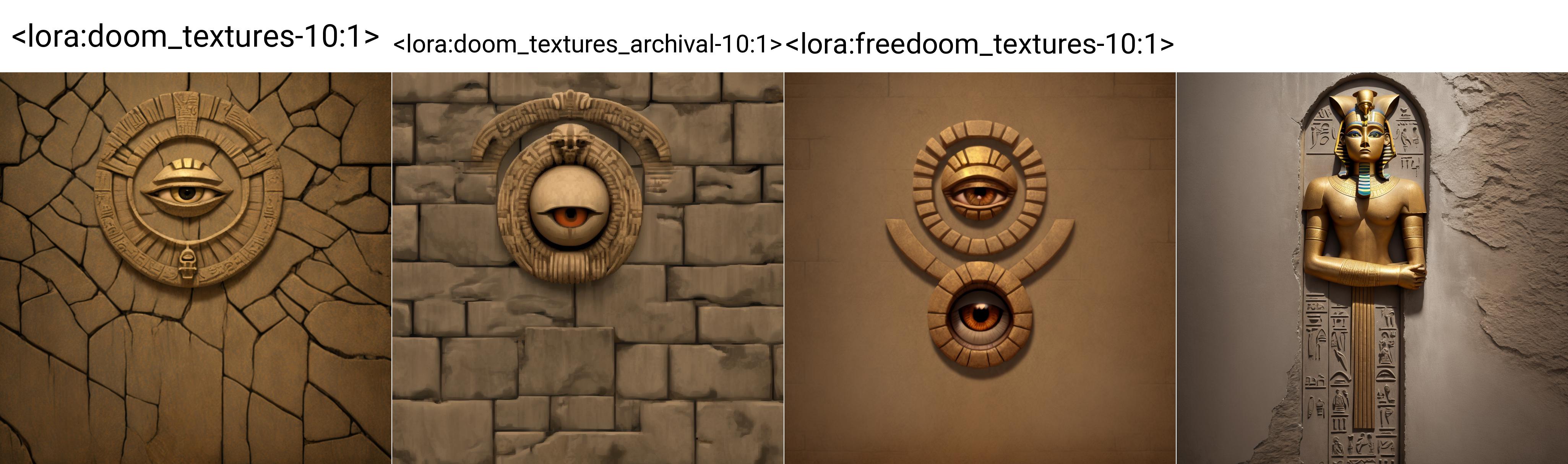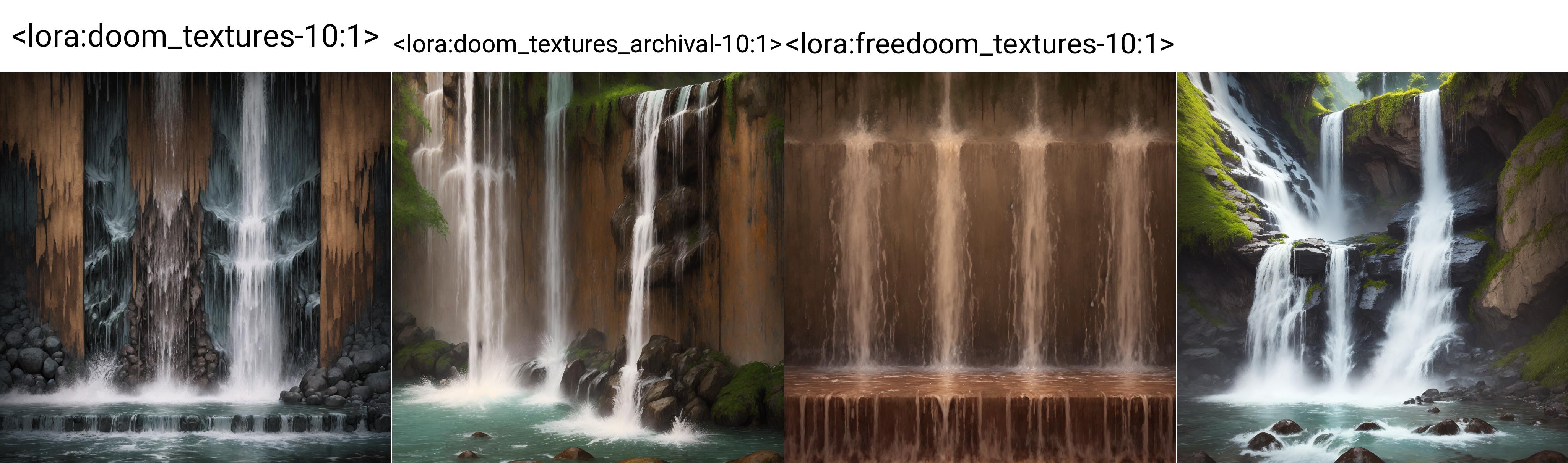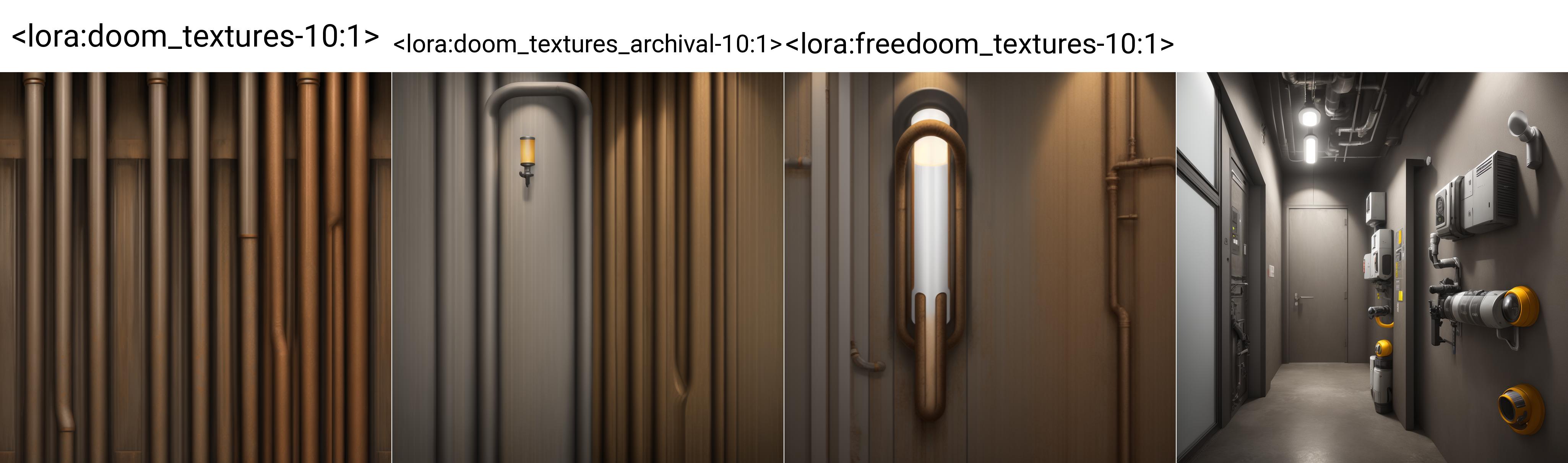 Doom and FreeDoom are trained on doom and freedoom textures with same tags but obviously, in case of freedoom - textures from freedoom used as stand-ins for doom textures. The resulting LoRAs came out a bit weaker, so for better results with strong-styled checkpoints (such as revanimated) you'll need to use power between 1 and 1.5.