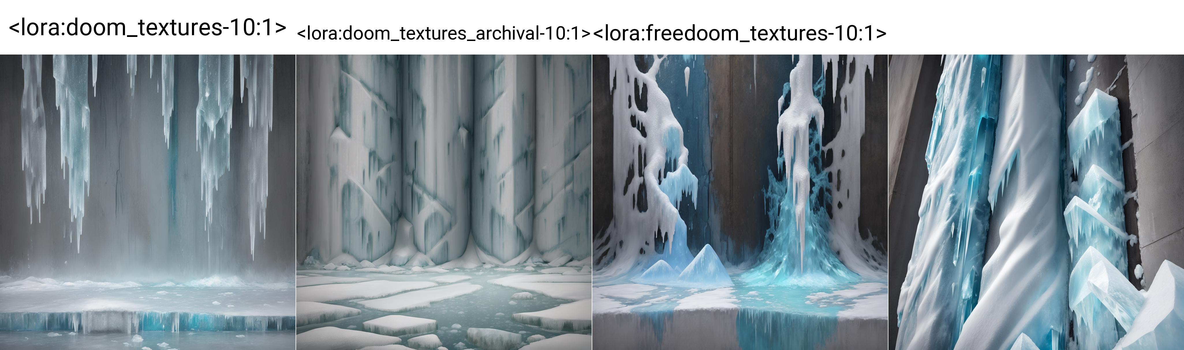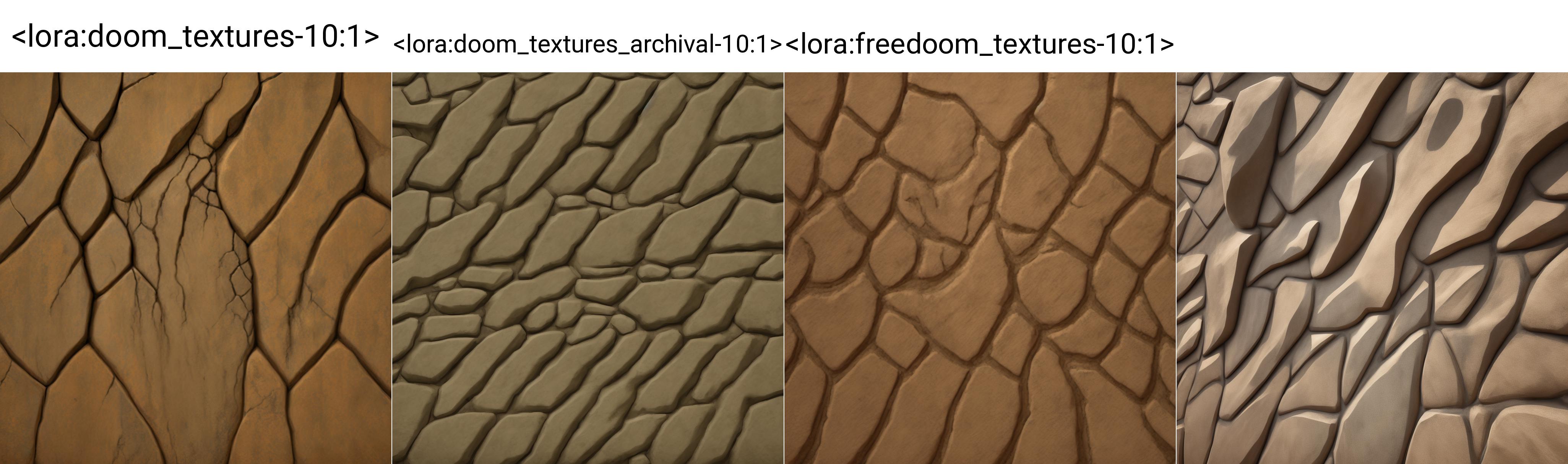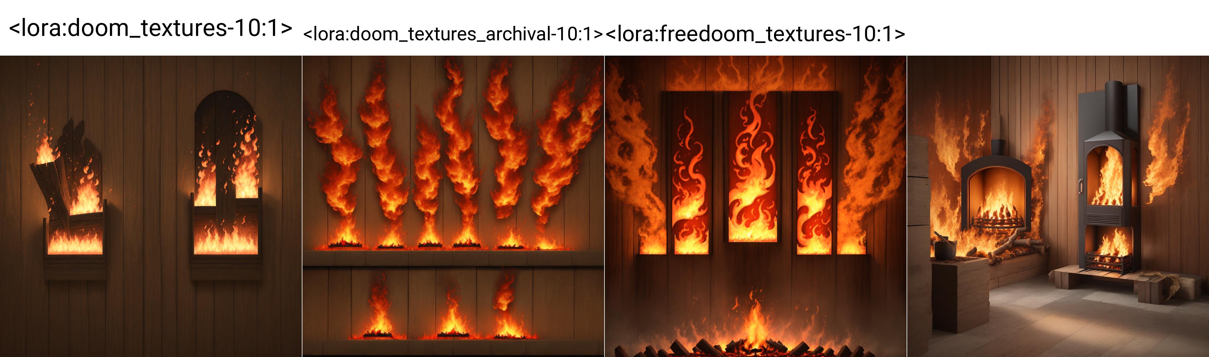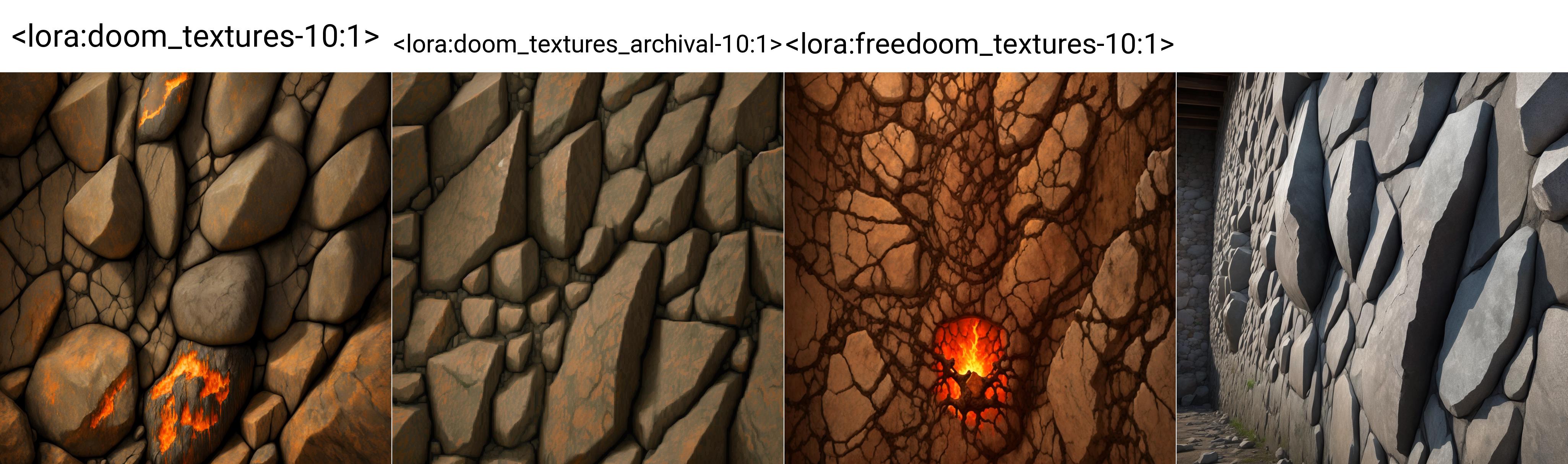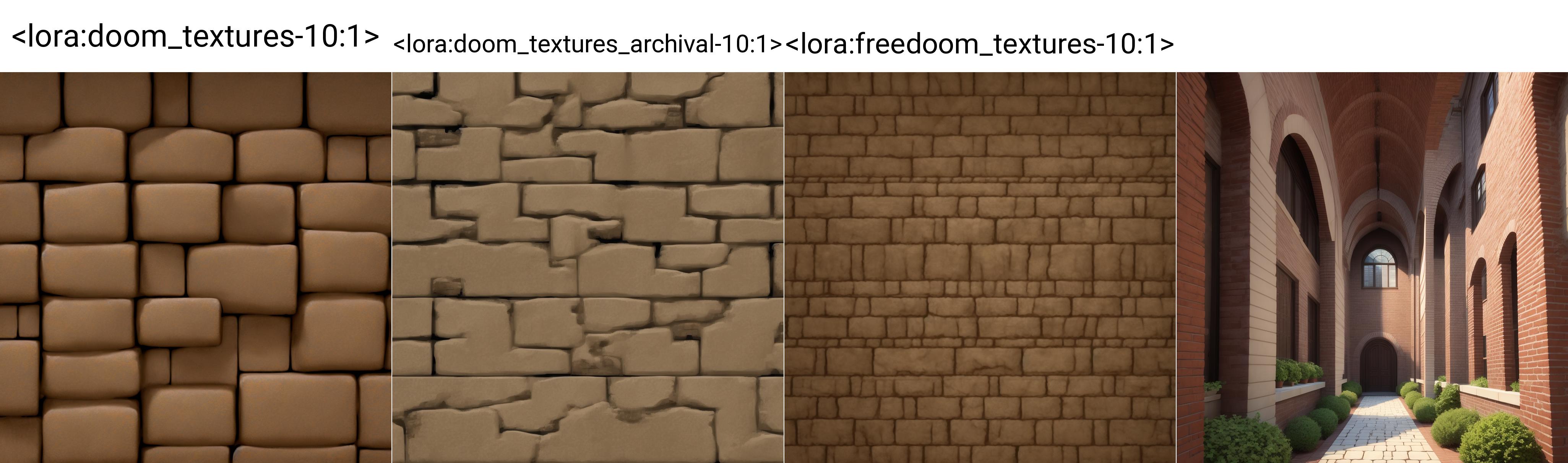 Doom and FreeDoom are trained on doom and freedoom textures with same tags but obviously, in case of freedoom - textures from freedoom used as stand-ins for doom textures. The resulting LoRAs came out a bit weaker, so for better results with strong-styled checkpoints (such as revanimated) you'll need to use power between 1 and 1.5.
