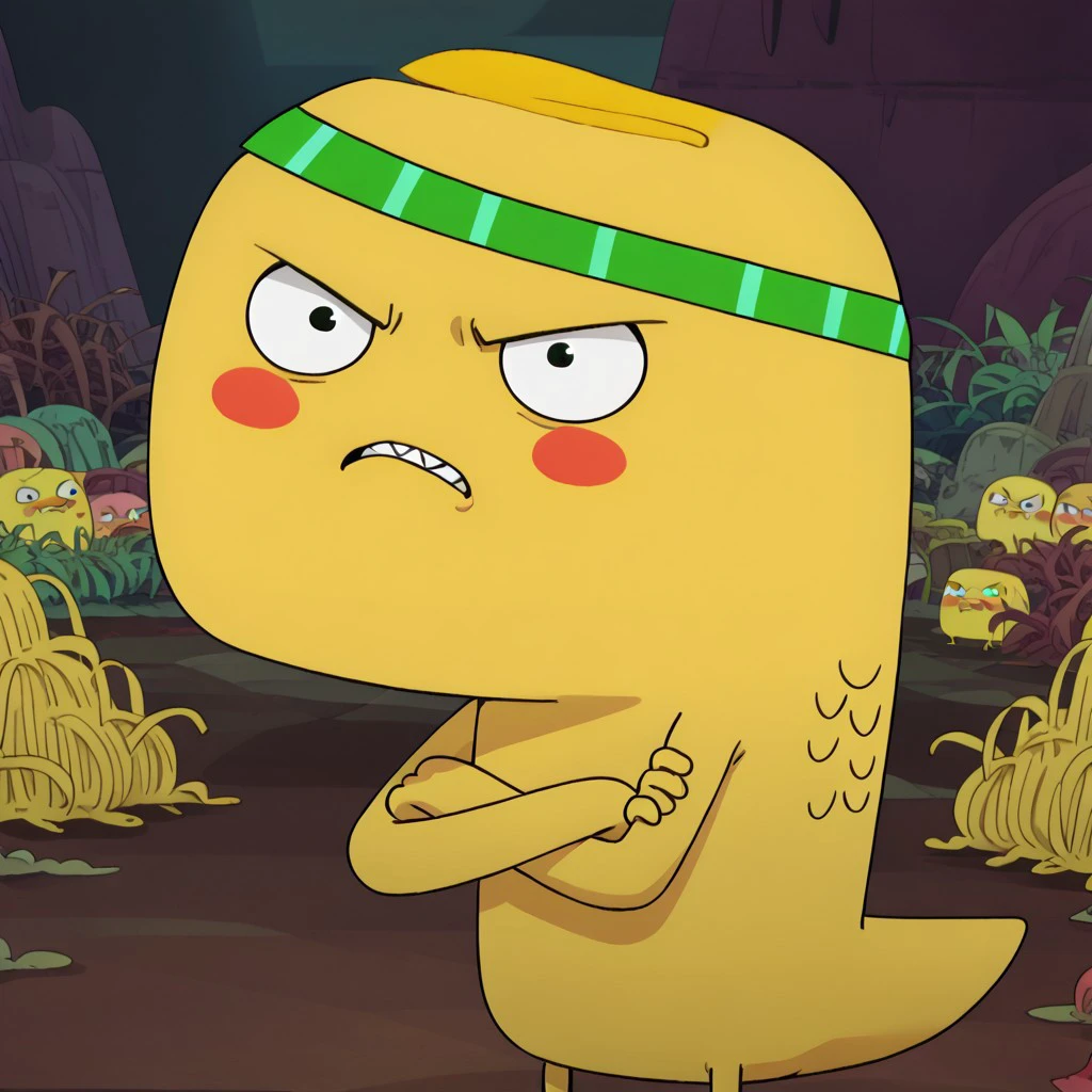 Dino C. Goody, yellow dinosaur, green and blue striped headband