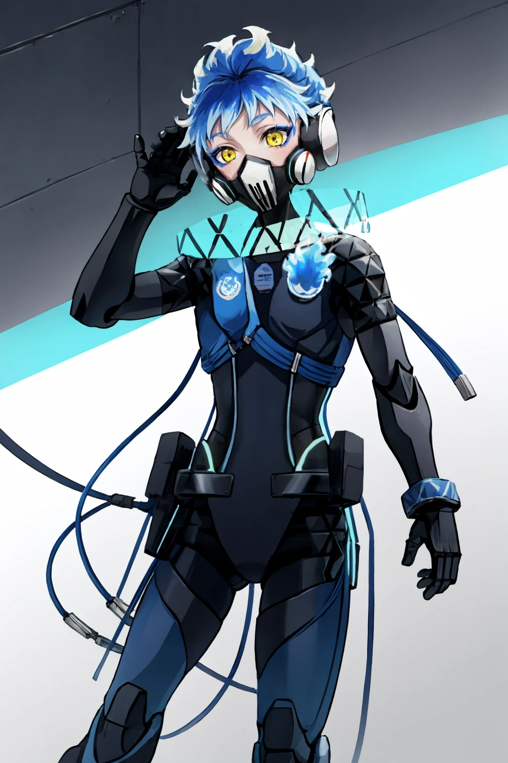 Default Outfit: fiery hair, blue fire, headphones, mechanical parts, robot joints