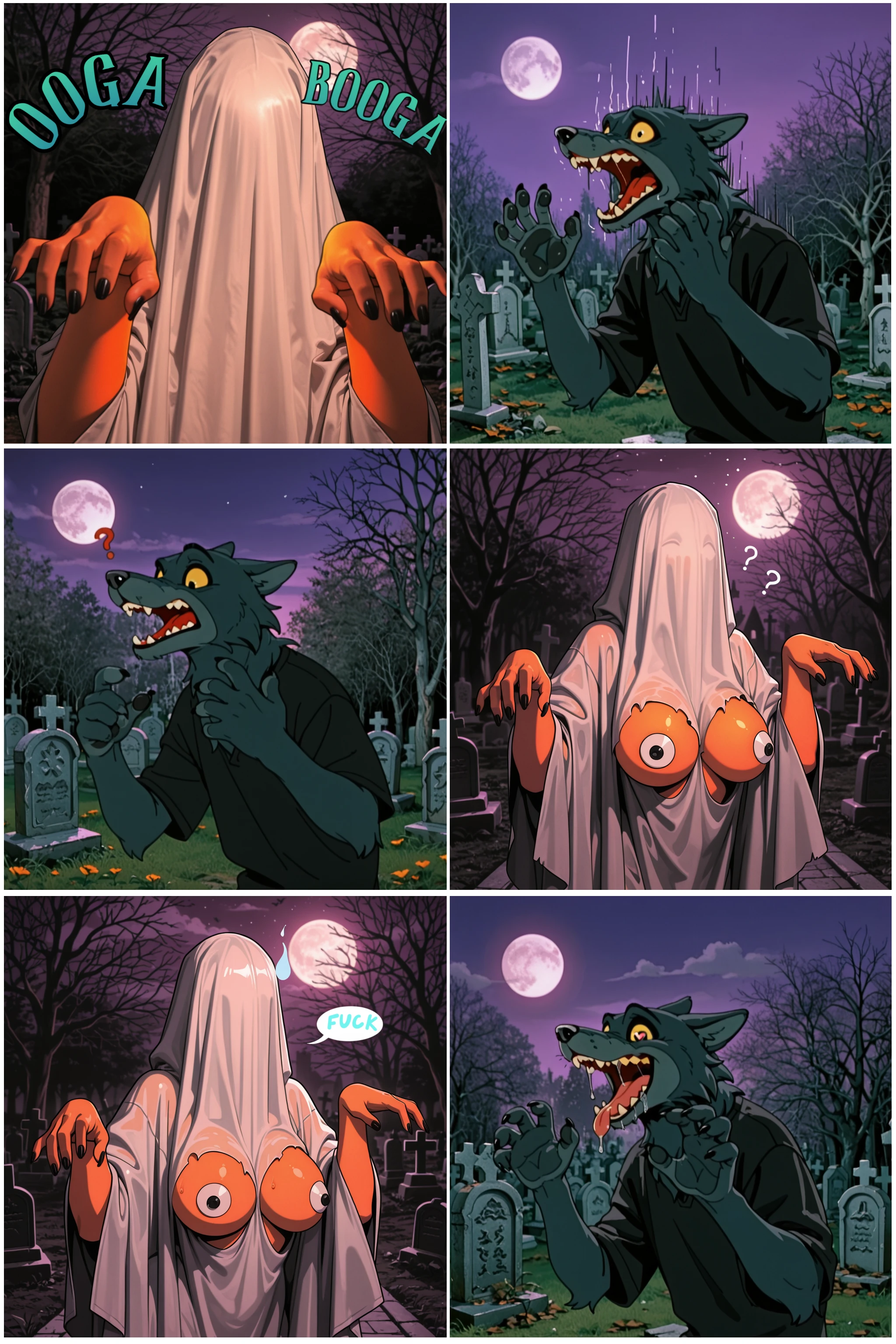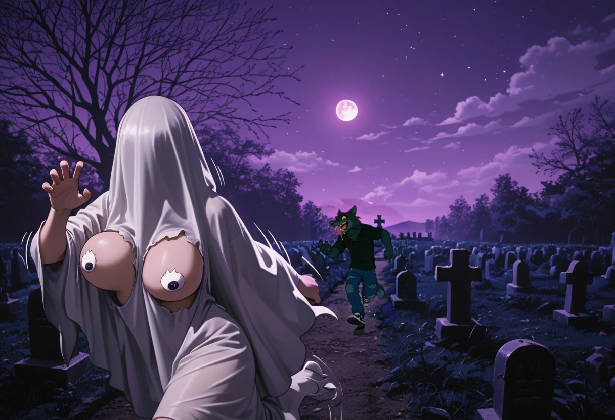 ghost costume, exposed breasts, covered nipples, covered face, covered eyes,