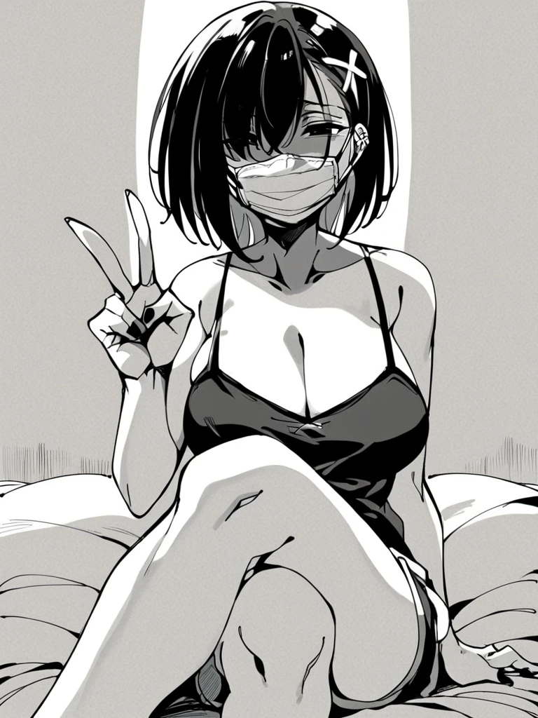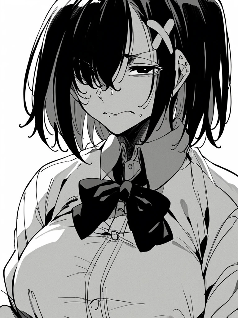 Azami: azami kb, black hair, medium hair, hair over one eye, black eyes, x hair ornament, large breasts,