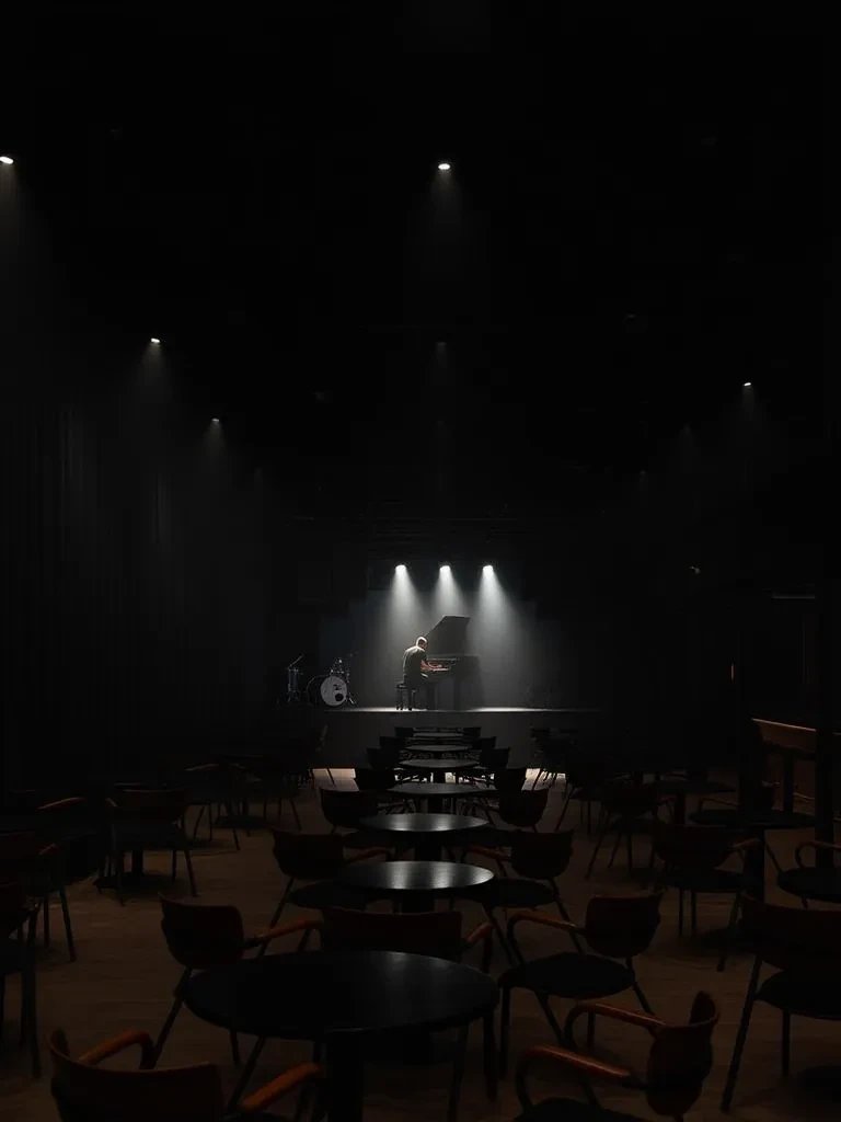 WD, This atmospheric, dimly-lit bar features a cozy, intimate ambiance perfect for live music enthusiasts. The room is adorned with round, dark wooden tables and matching chairs, creating a warm and inviting seating area. The background showcases a stage with a musician in action, illuminated by soft, focused spotlights. The walls are adorned with subtle, ambient lighting and a neon sign, adding a modern touch to the vintage decor. The polished wooden floor enhances the overall aesthetic, making it an ideal spot for both relaxation and entertainment.