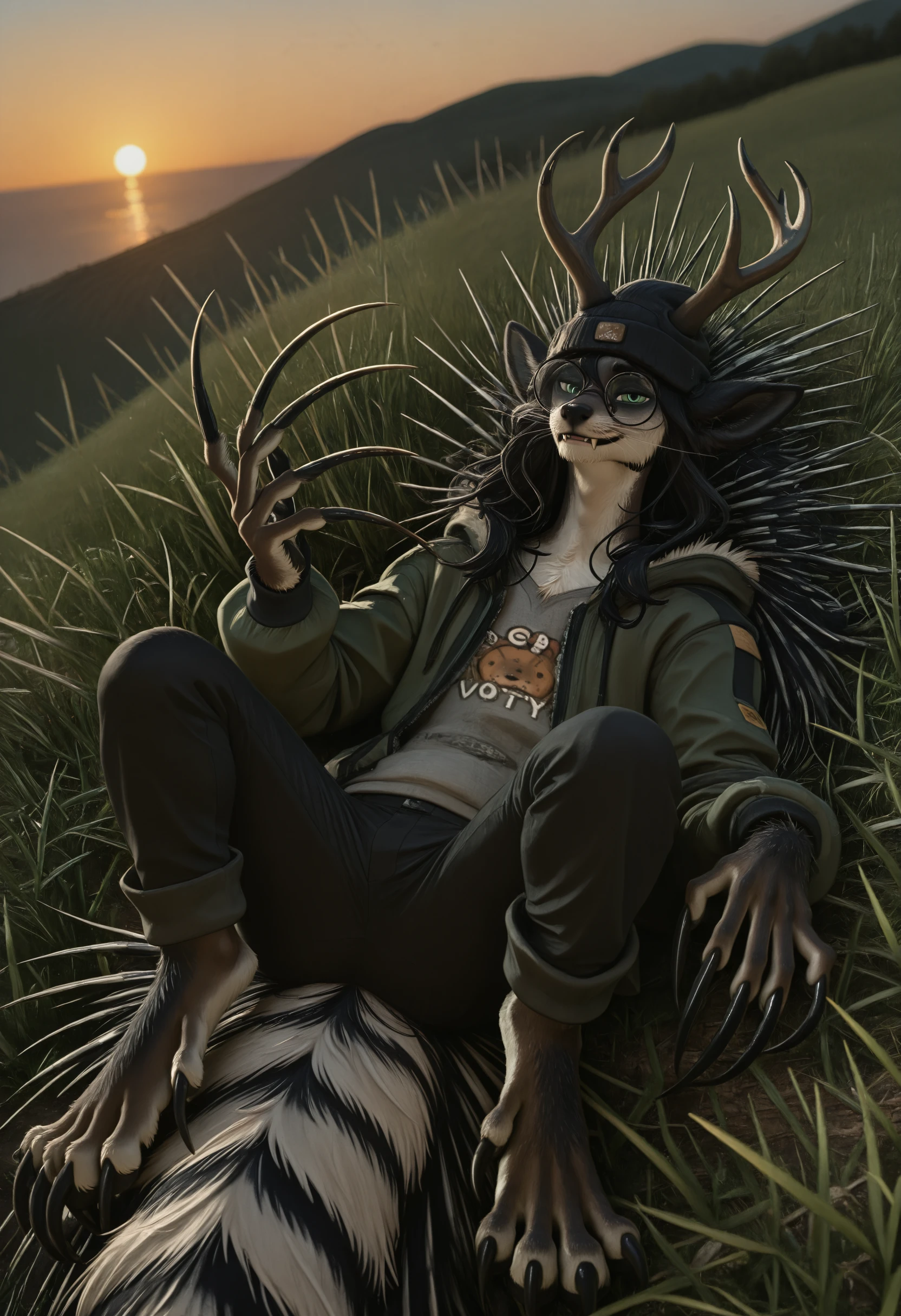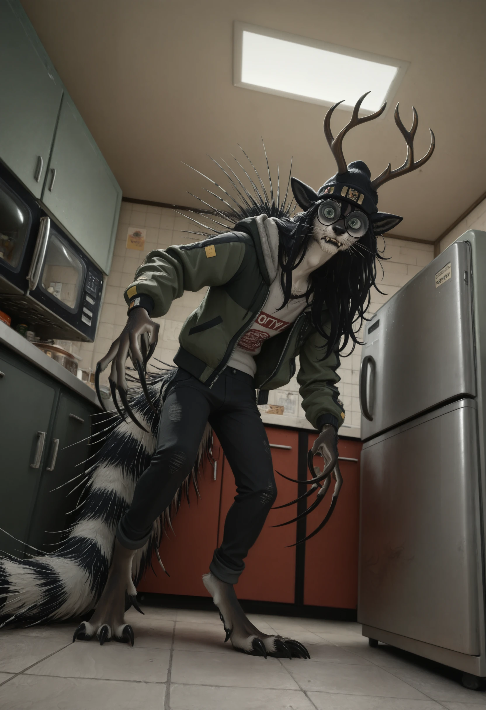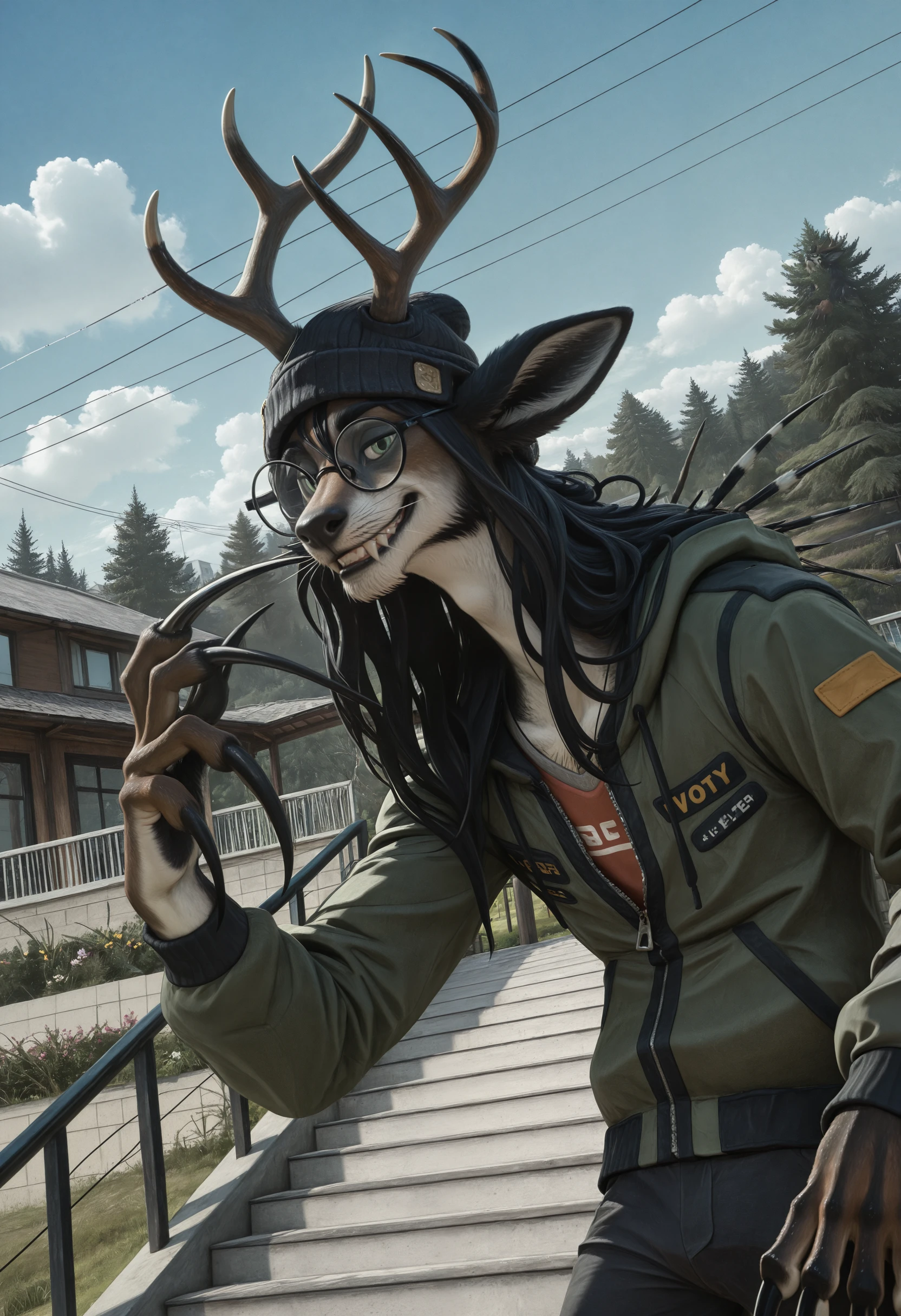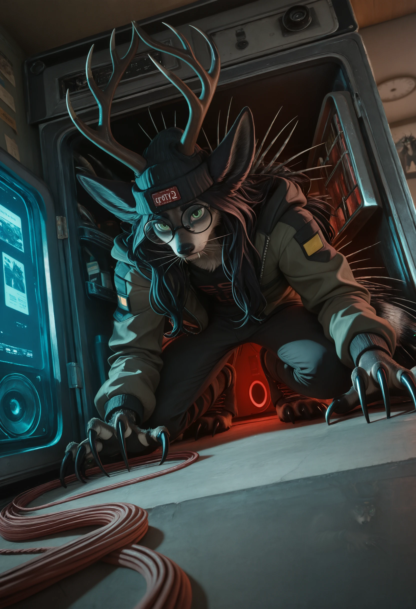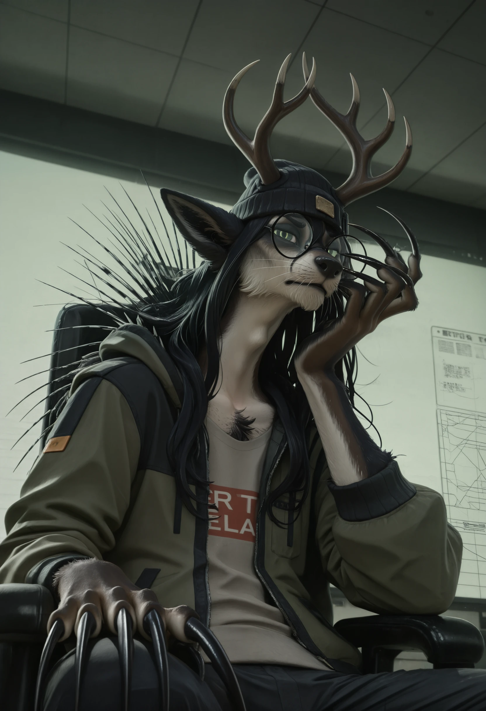 сrypt1d_k3l_votv, chimera, solo, antlers, black hair, looking at viewer, animal ears, long hair, 1boy, claws, furry, body fur, tail, whiskers, male focus, glasses, green eyes, long claws, porcupine quills, beanie, pants, shirt, jacket