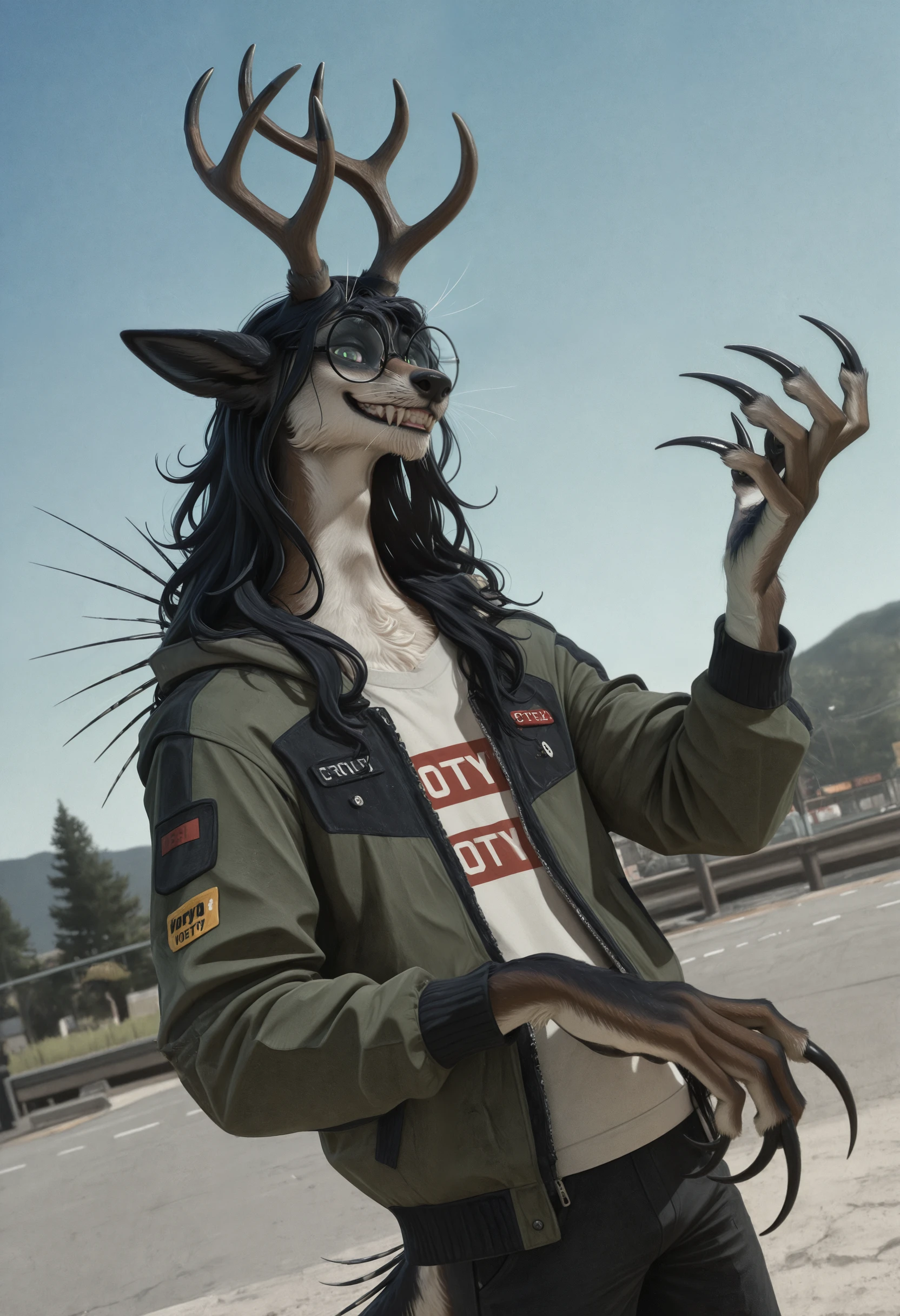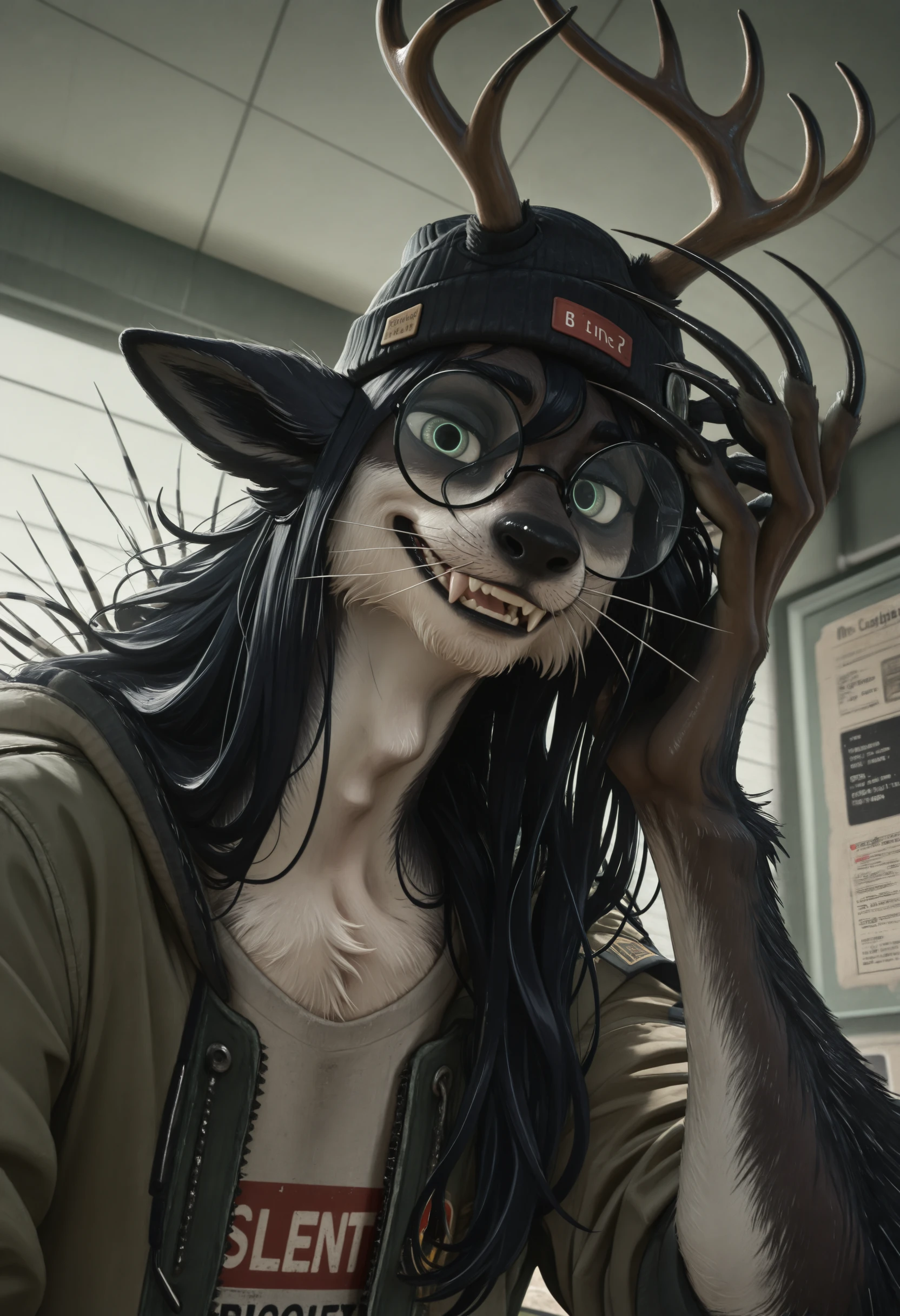 сrypt1d_k3l_votv, chimera, solo, antlers, black hair, looking at viewer, animal ears, long hair, 1boy, claws, furry, body fur, tail, whiskers, male focus, glasses, green eyes, long claws, porcupine quills, beanie, pants, shirt, jacketnsfw, worst quality, old, early, low quality, lowres, signature, username, logo, bad hands, mutated hands, breasts, human, humanoid, outline, logo, shirt print, printDescription