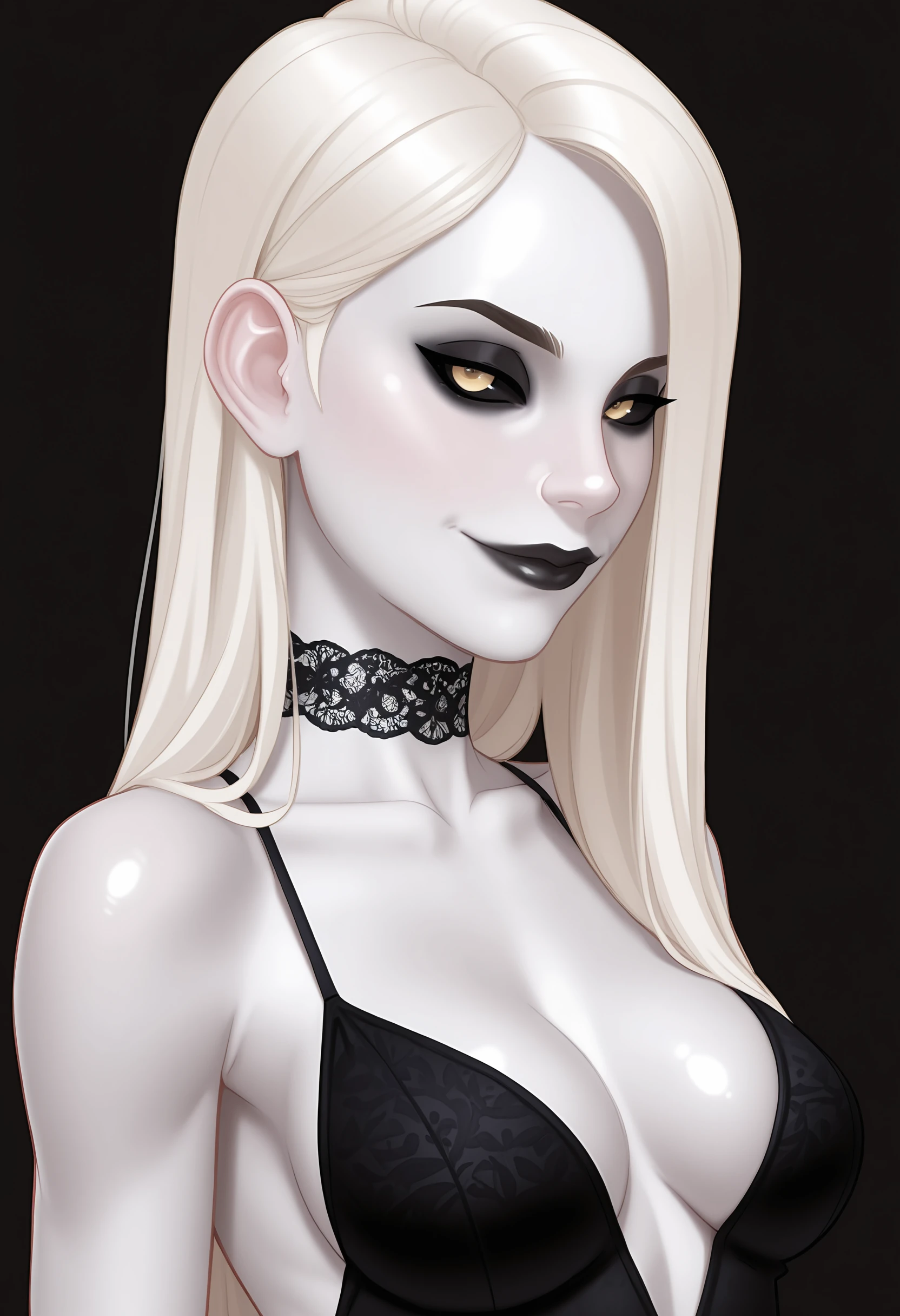 Bonus! How to make Gehenna Girl: 1girl, colored skin, white skin, white hair, side swept hair, long hair, colored sclera, black sclera, yellow eyes, black dress, black lips, black eyeshadow
