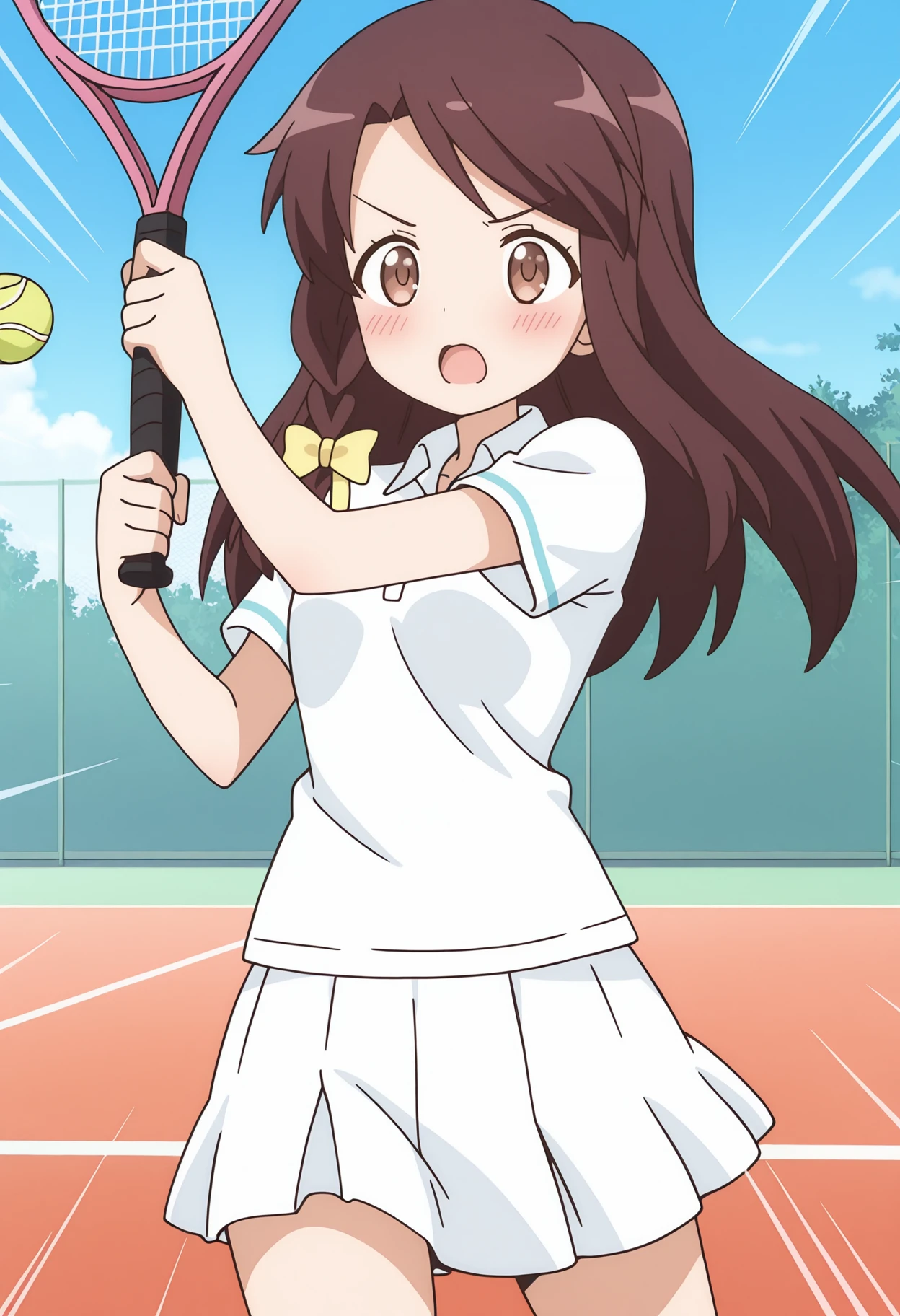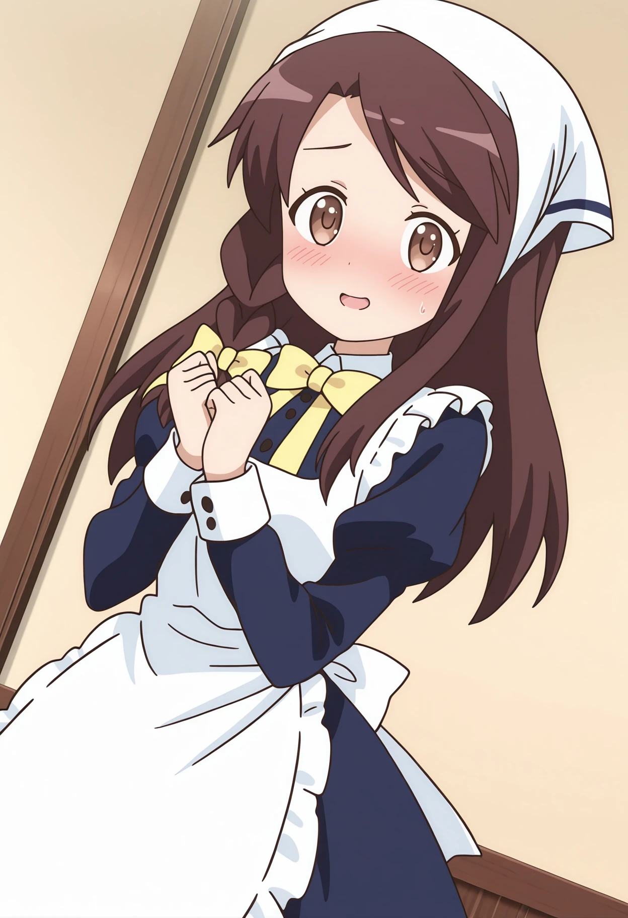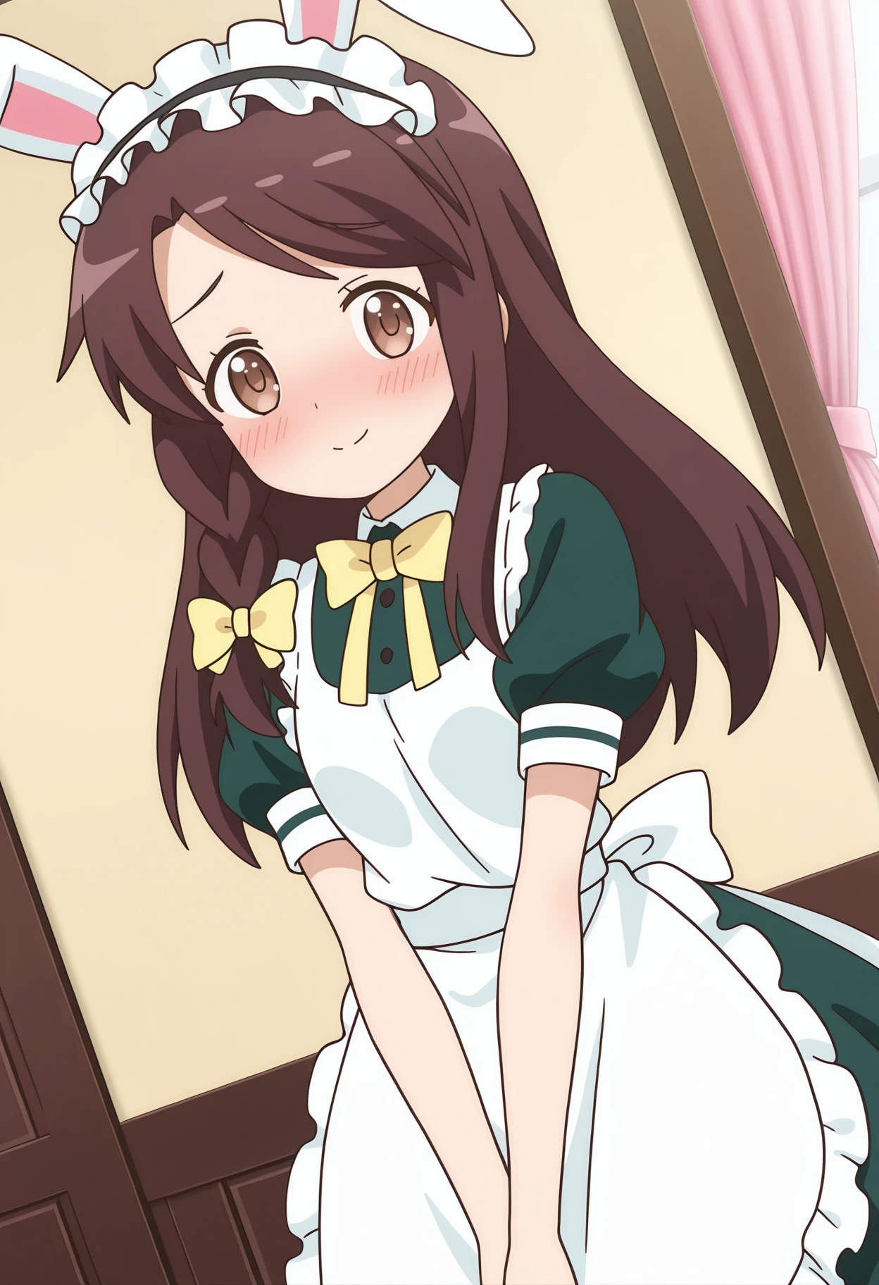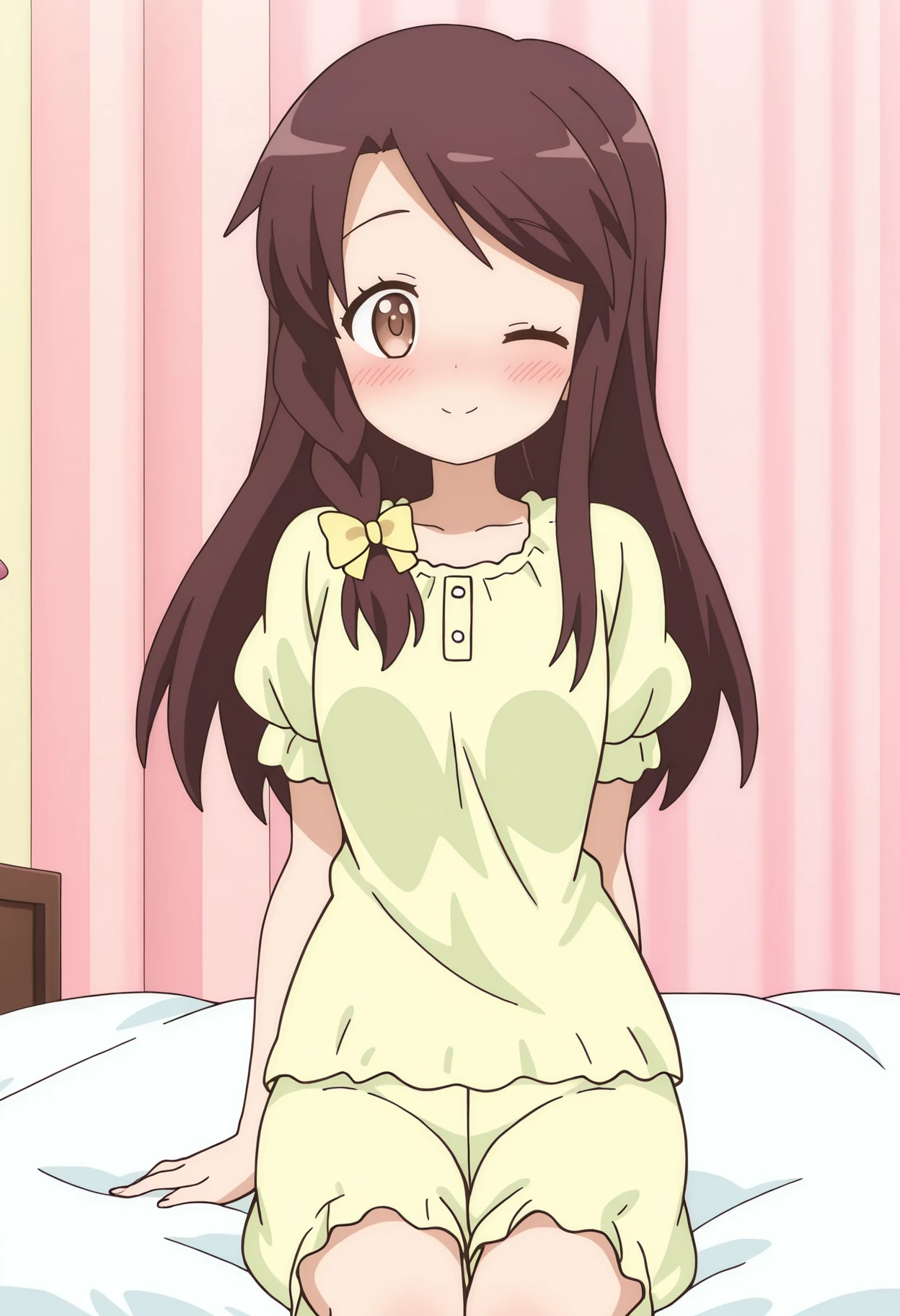 kinmhono, long hair, brown hair, brown eyes, side braid, hair bow, yellow bow,