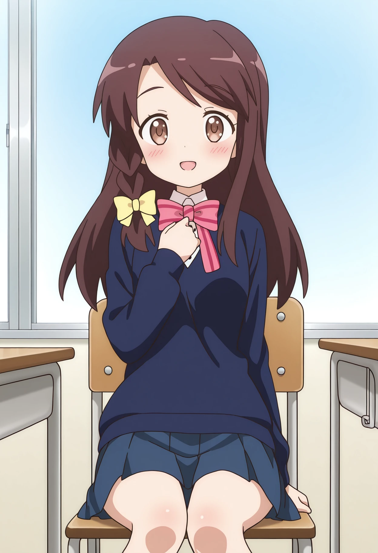 school uniform, pink bowtie, striped bowtie, blue sweater, long sleeves, skirt, pleated skirt,
