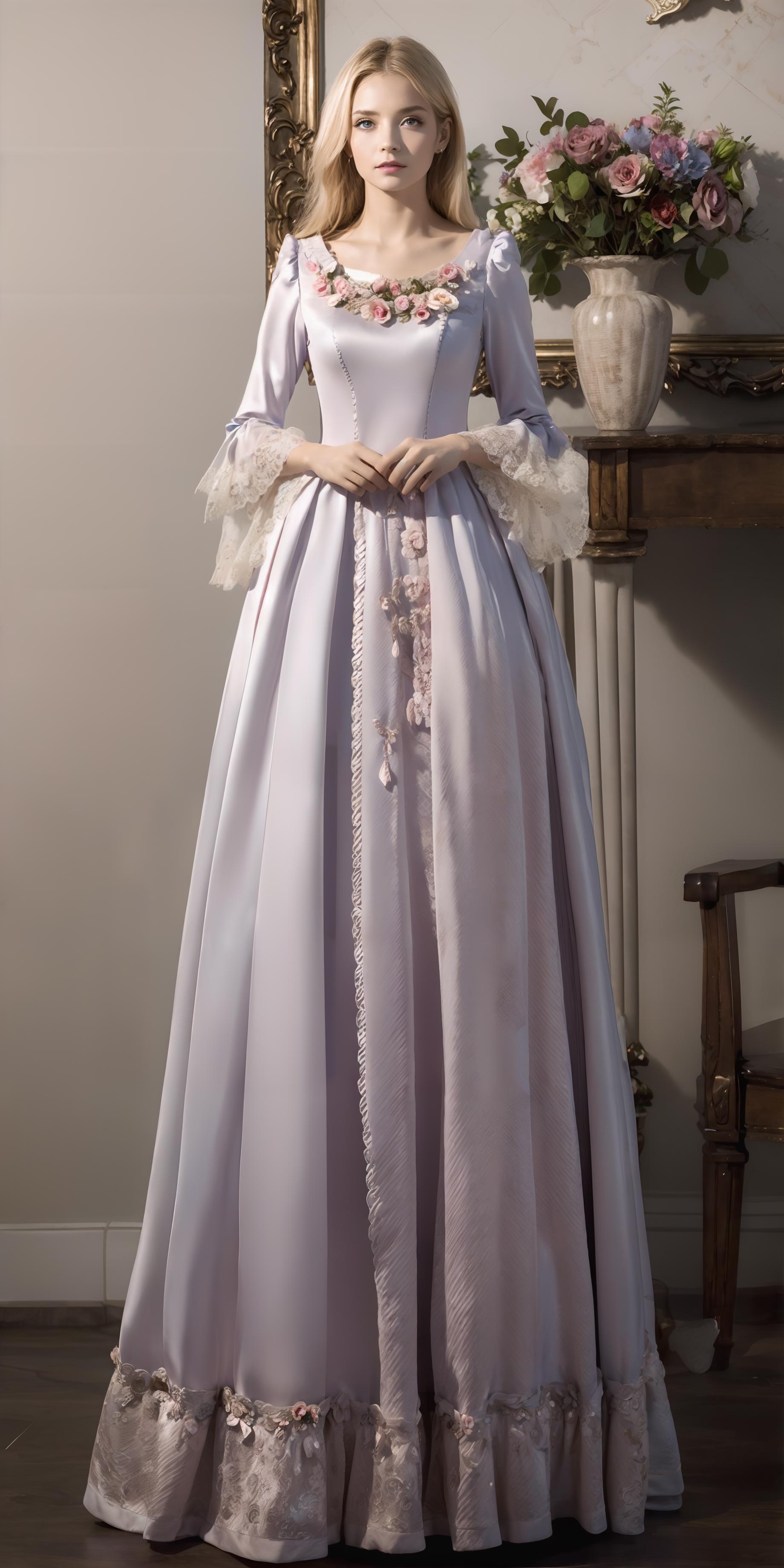 触发词: "ornate pink european style princess dress", "long/short sleeves", "high heels", 但不必拘泥于这些模板,你可以自己作适当修改,可以让你获得不同样子的裙子。还有,调整lora的权重也可以变换裙子的样子。