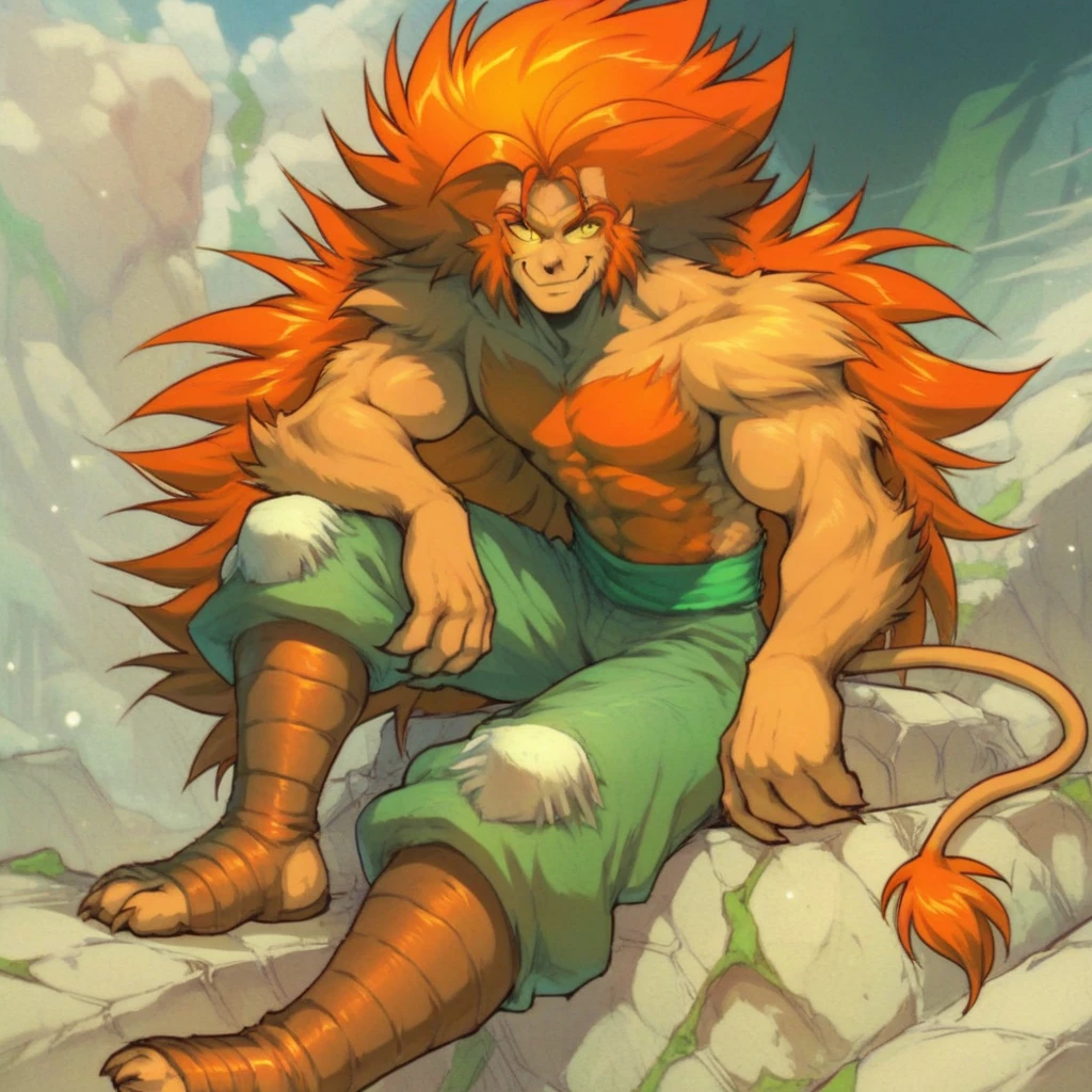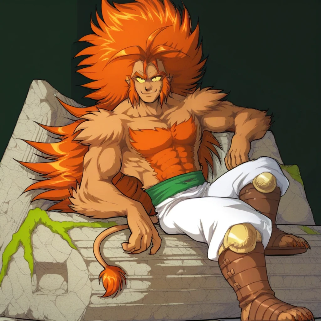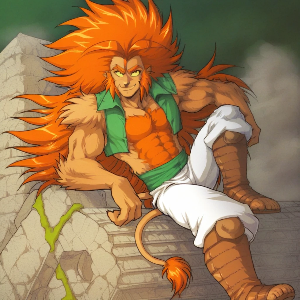Recommanding using those keywords : gryf, jaguarian, orange hair, beige fur, claws ,lion tail with orange end ,yellow eyes ,slit pupils.