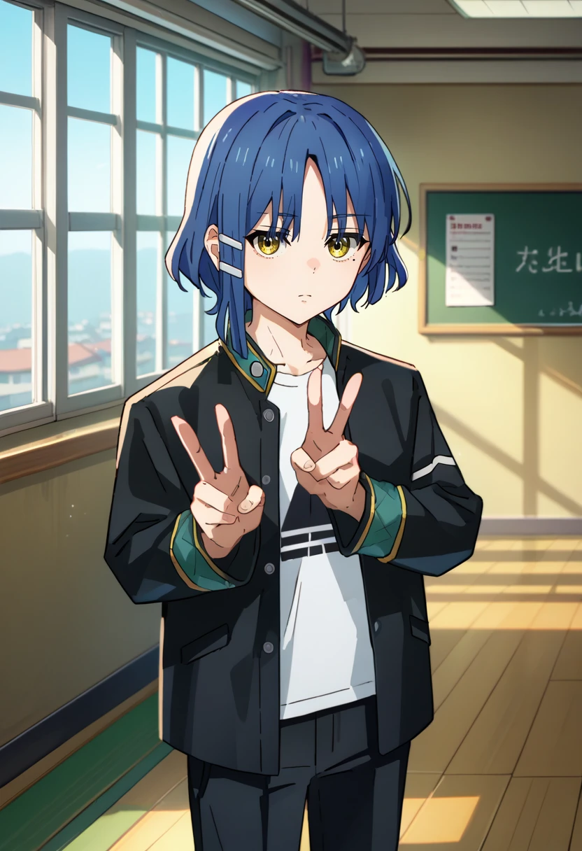Trigger + Additional Tags: furinuniform, black jacket, open jacket, long sleeves, black pants