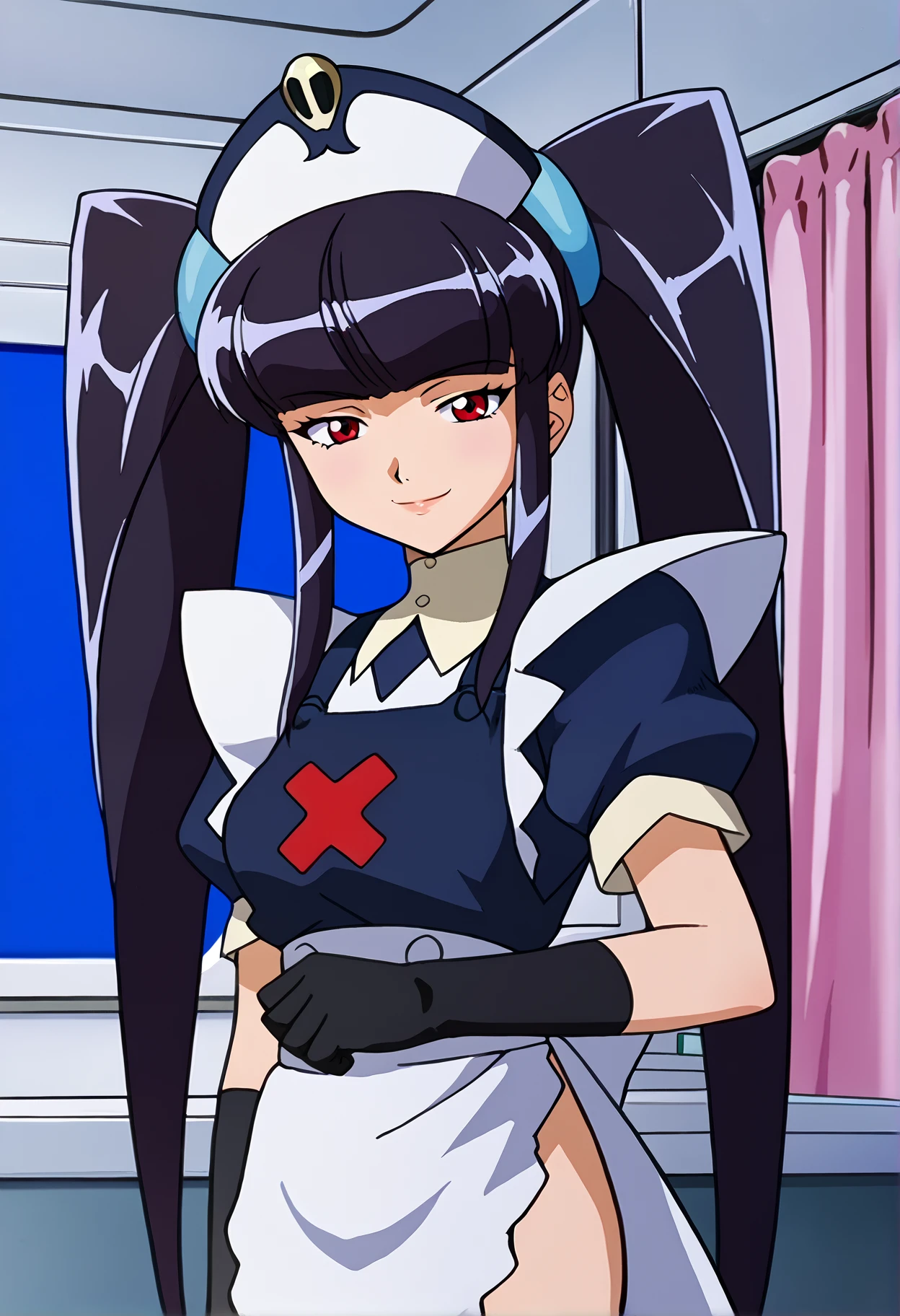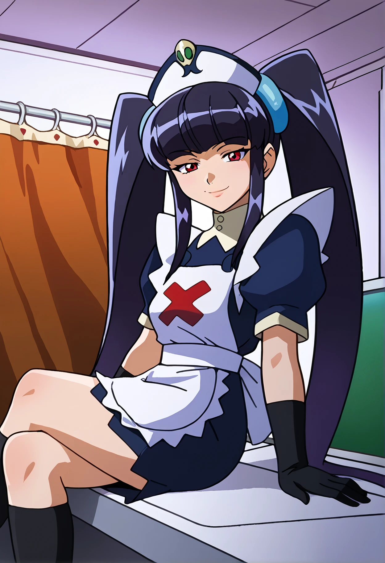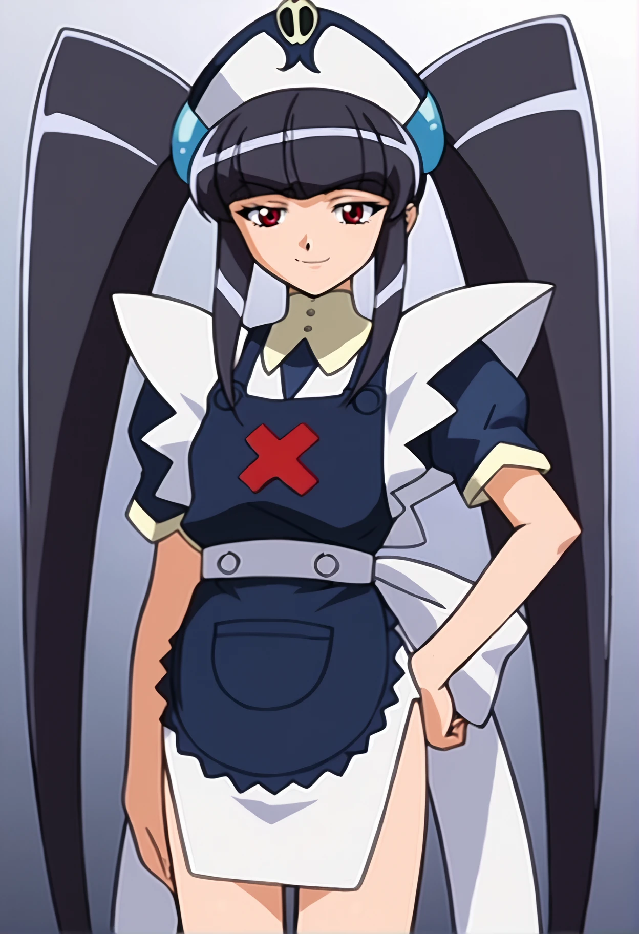 paiway_underberg, red eyes, long hair, black hair, twintails, very long hair, sidelocks, blunt bangs,