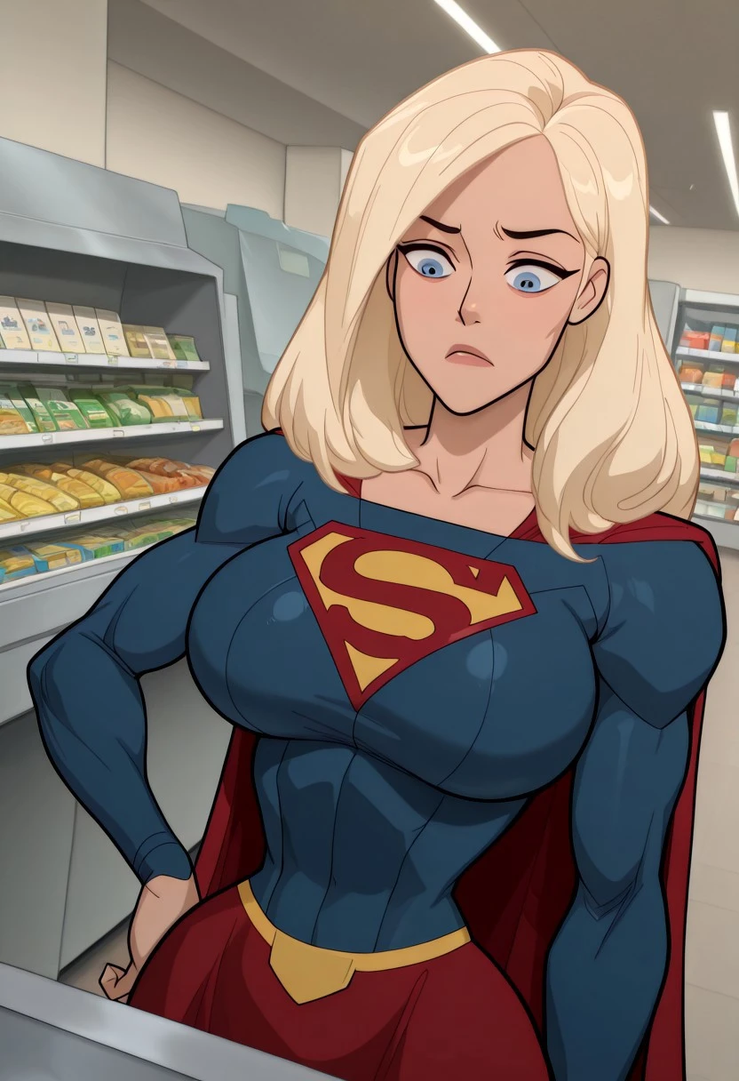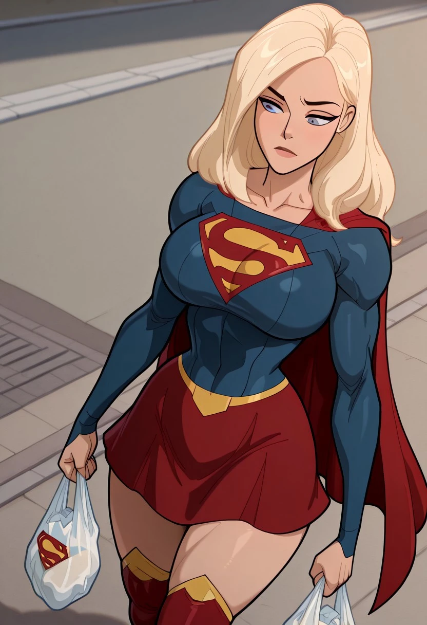 red skirt, red boots, thigh high boots, blue suit, suit logo, superhero, collarbone, miniskirt, gold trim, costume, red cape, retro art style,
