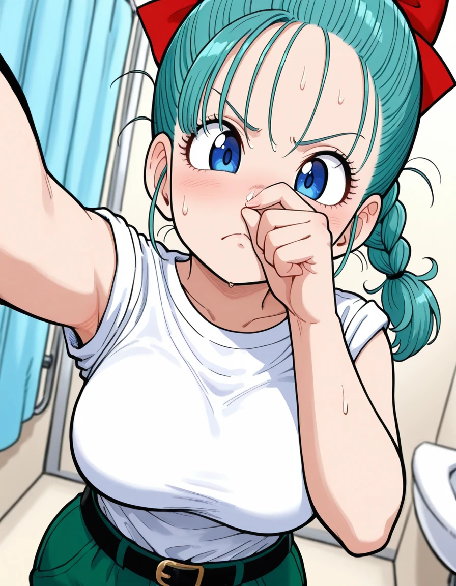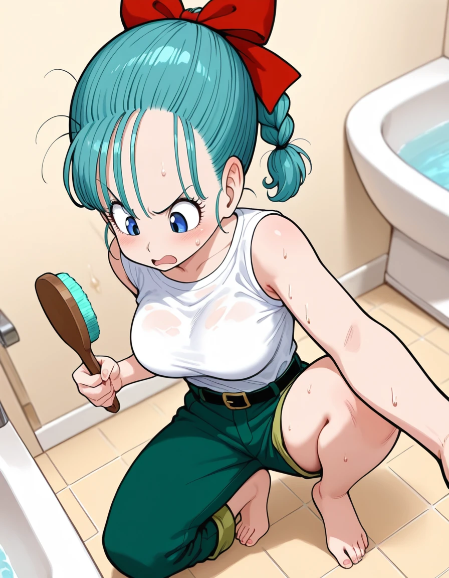 (single braid, wispy bangs, forehead, hair bow), (white sleeveless t-shirt, black belt, green pants, pants rolled up, barefoot)