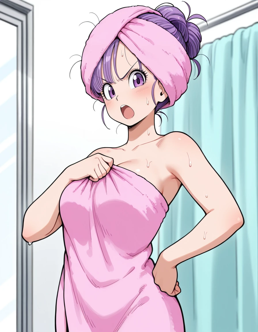 (wispy bangs, forehead, hair up, pink towel, towel wrapped head, naked towel)