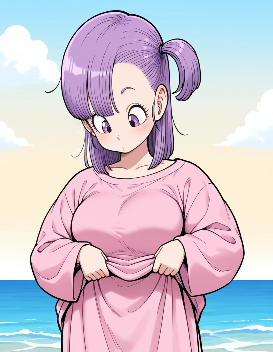 (one side up, medium hair, blunt bangs, asymmetrical bangs), (hair tie, pink pajama, long sleeves)
