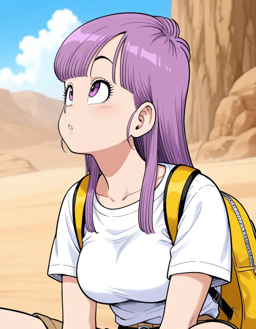 (ponytail, wispy bangs), (metal hair tube, metal choker, blue vest, arabian vest, yellow trim, white tube top, metal wristband, red sash, white pants, red anklet, red sandals)