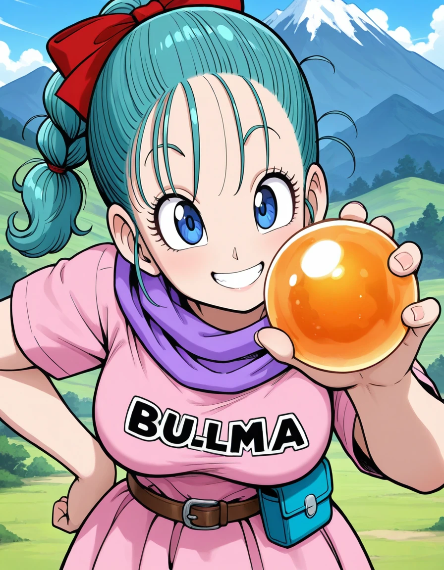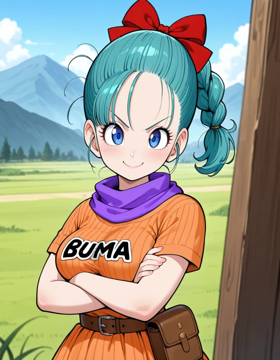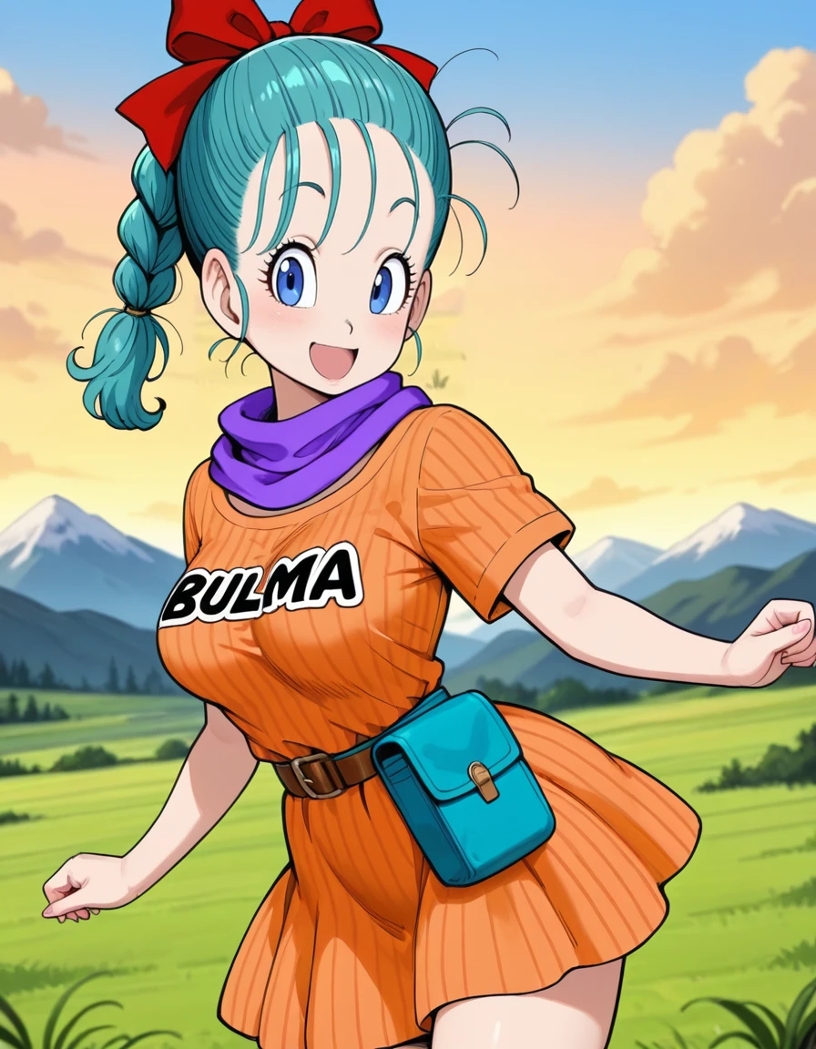 (single braid, wispy bangs, forehead, hair bow), (purple scarf, orange dress, clothes writing, short sleeves, brown belt, aqua pouch, purple leg warmers, aqua sneakers)