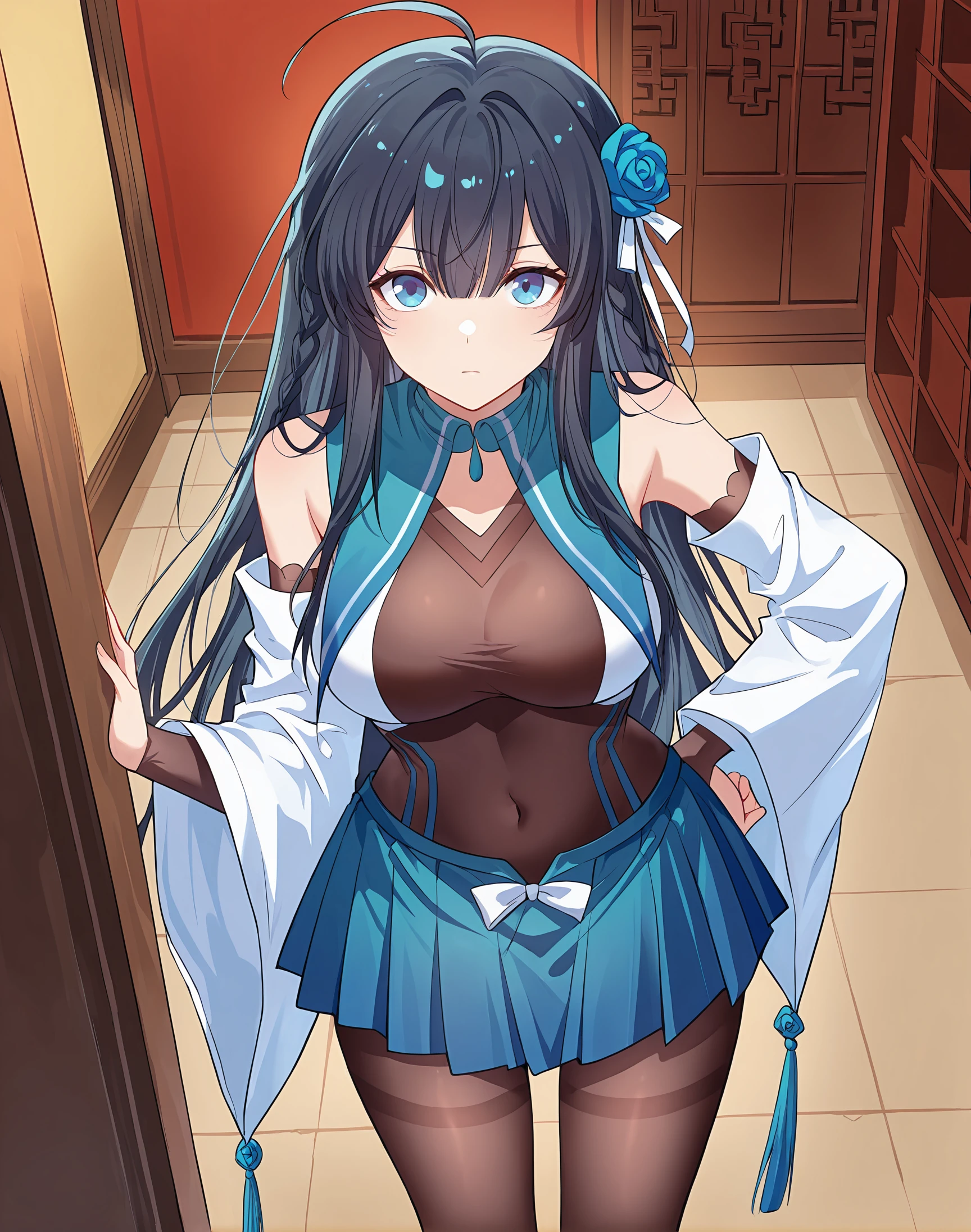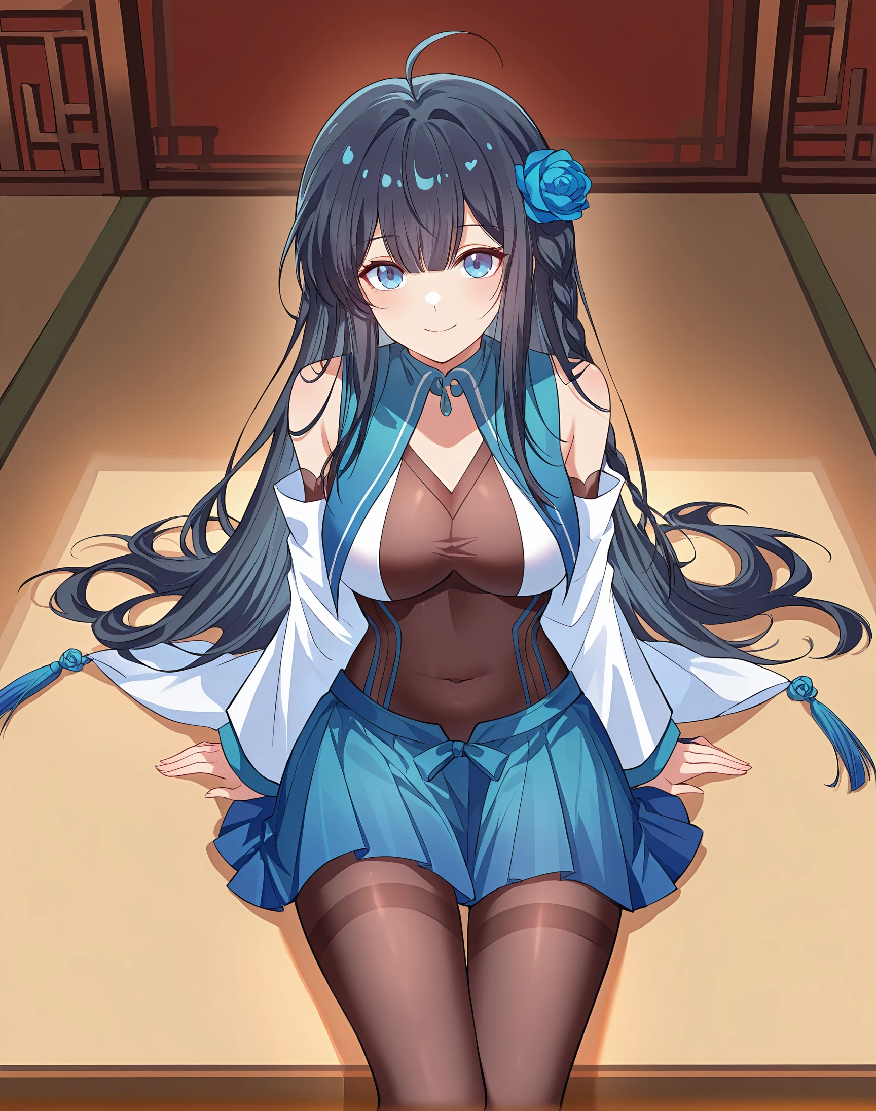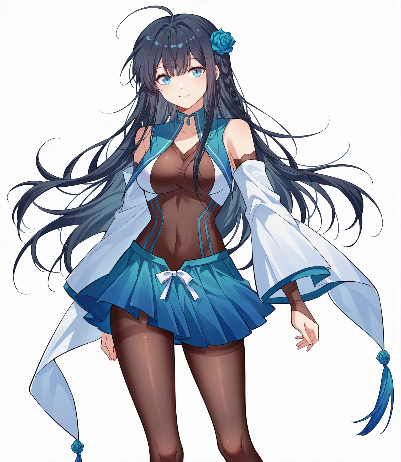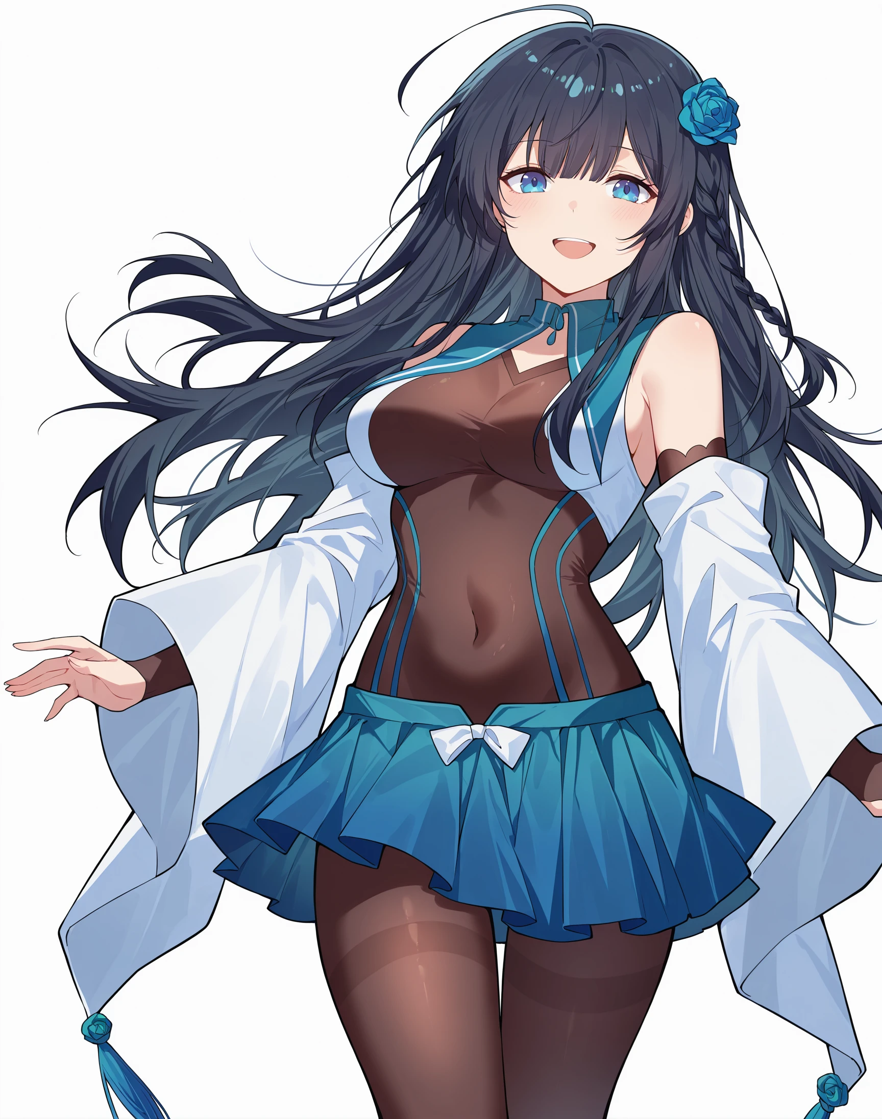 yuer, 1girl, hair ornament, detached sleeves, pantyhose, blue eyes, long hair, black hair, hair ornament, breasts, ahoge, braid, hair flower, blue skirt, blue flower, bodystocking