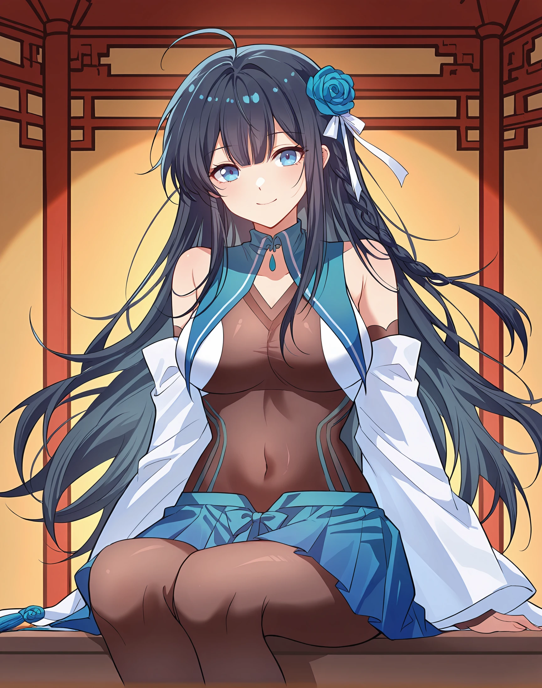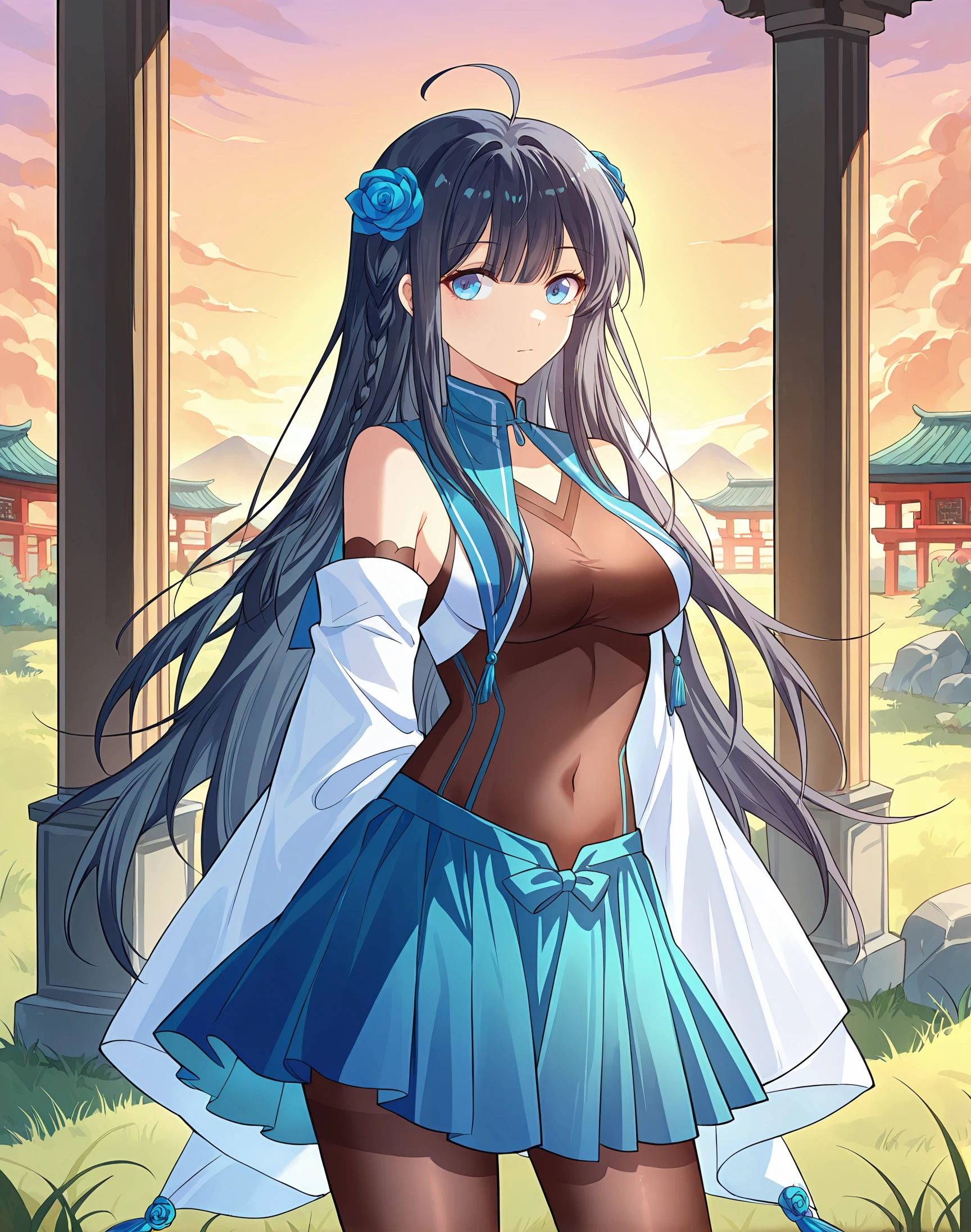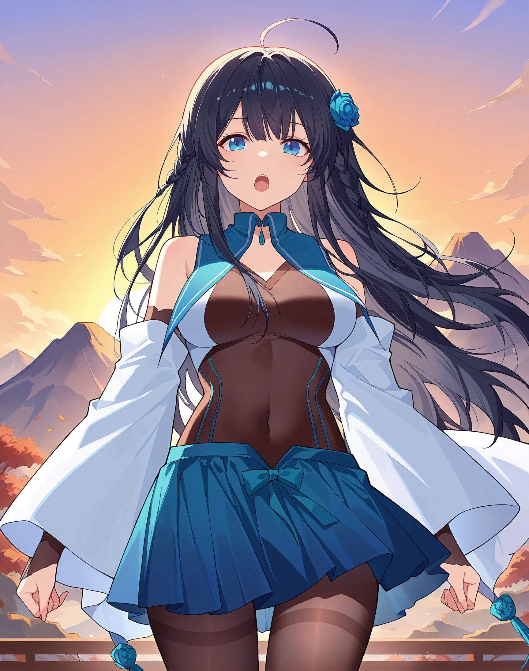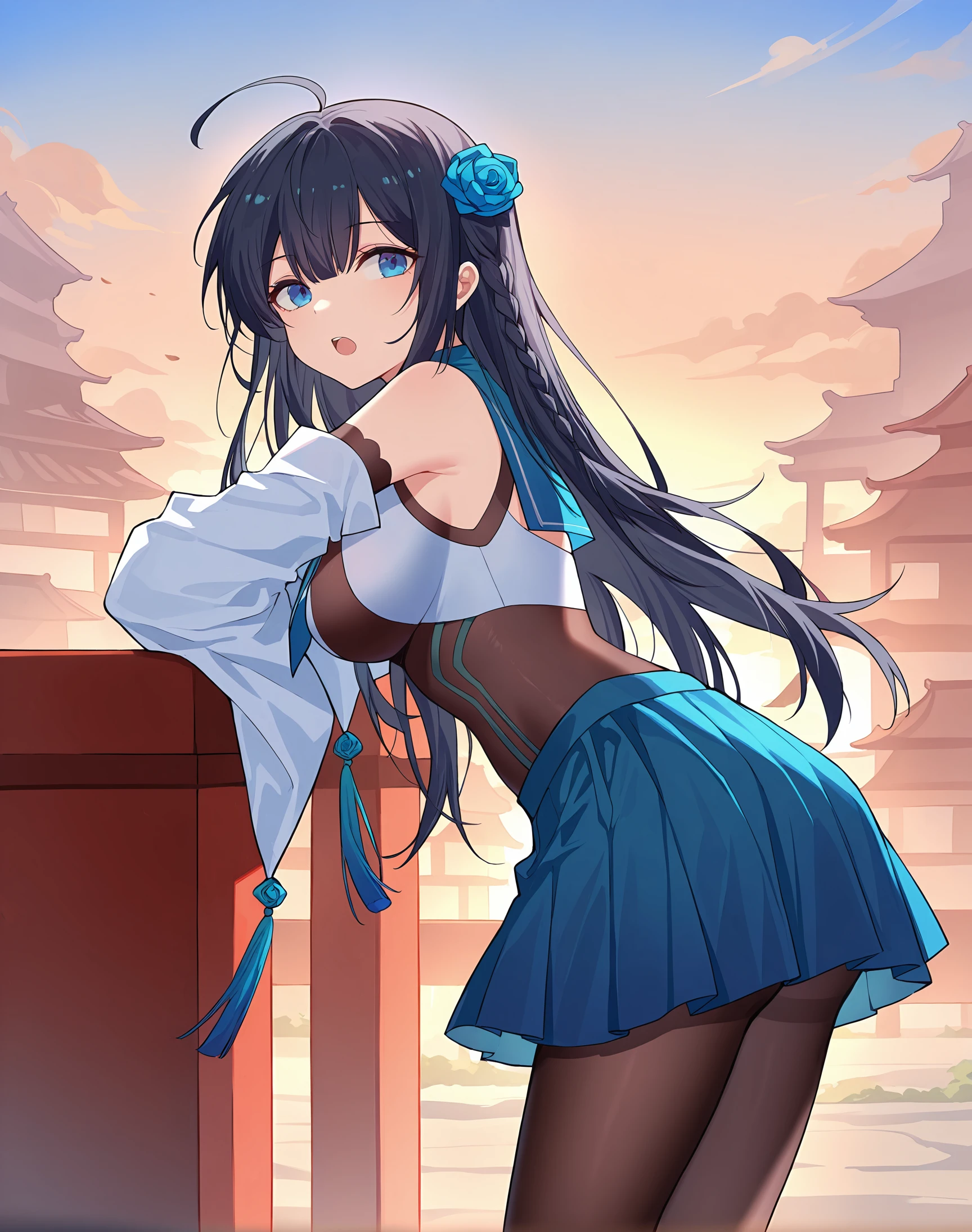 yuer, 1girl, hair ornament, detached sleeves, pantyhose, blue eyes, long hair, black hair, hair ornament, breasts, ahoge, braid, hair flower, blue skirt, blue flower, bodystocking