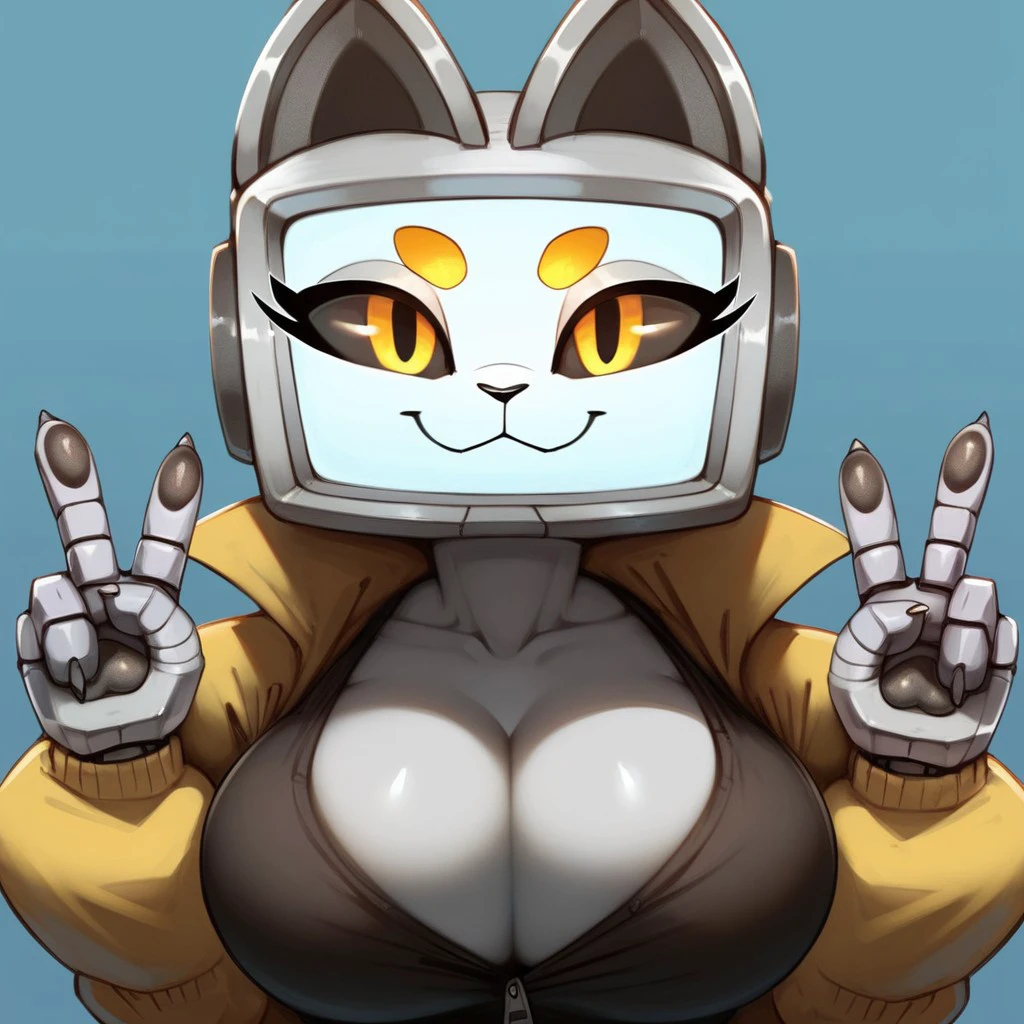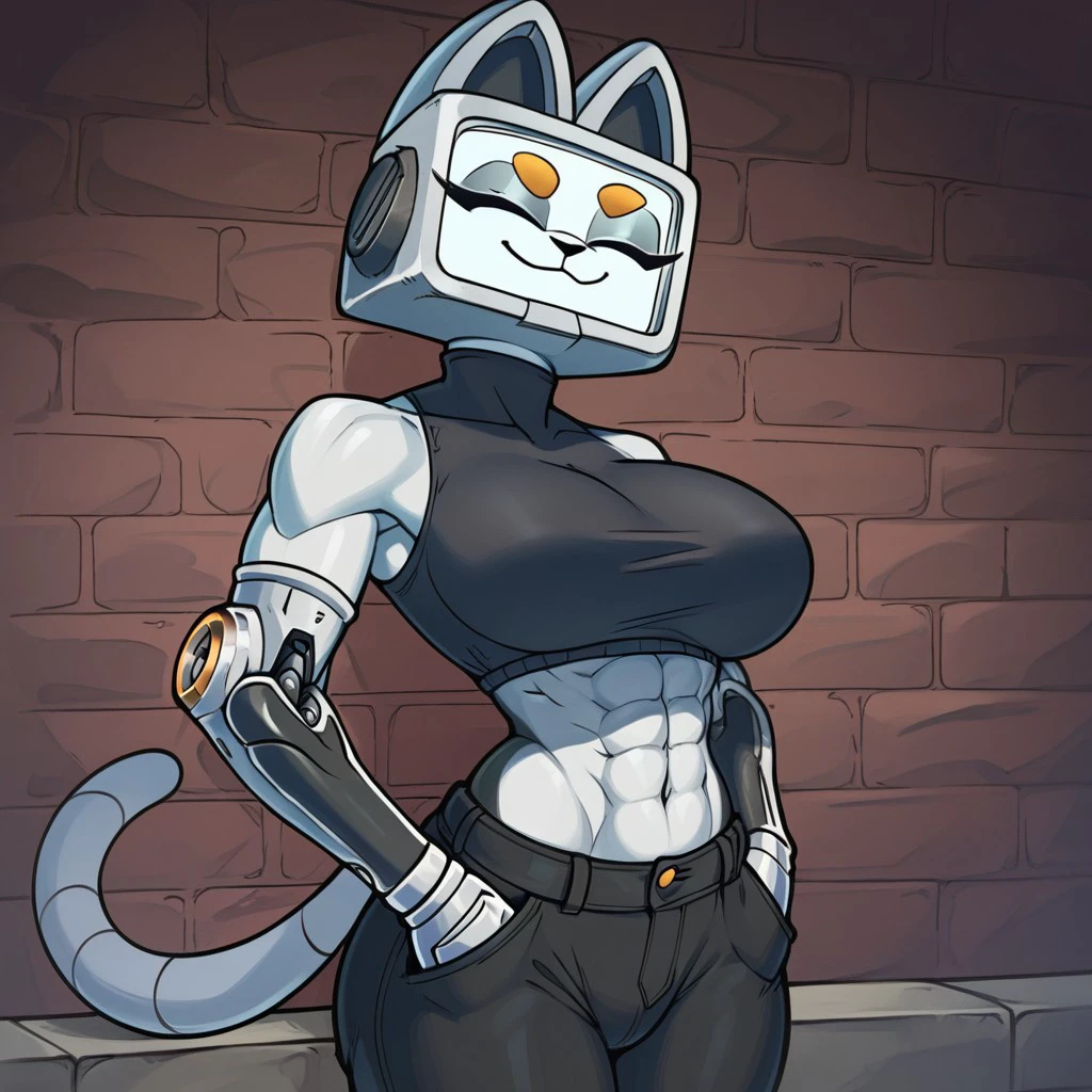 Positive Prompts: Cali, furry, anthro, feline, robot, cat ears, screen head, screen face, yellow eyebrows, black sclera, yellow eyes, black pupils, black nose, grey body, robotic arm, robotic tail