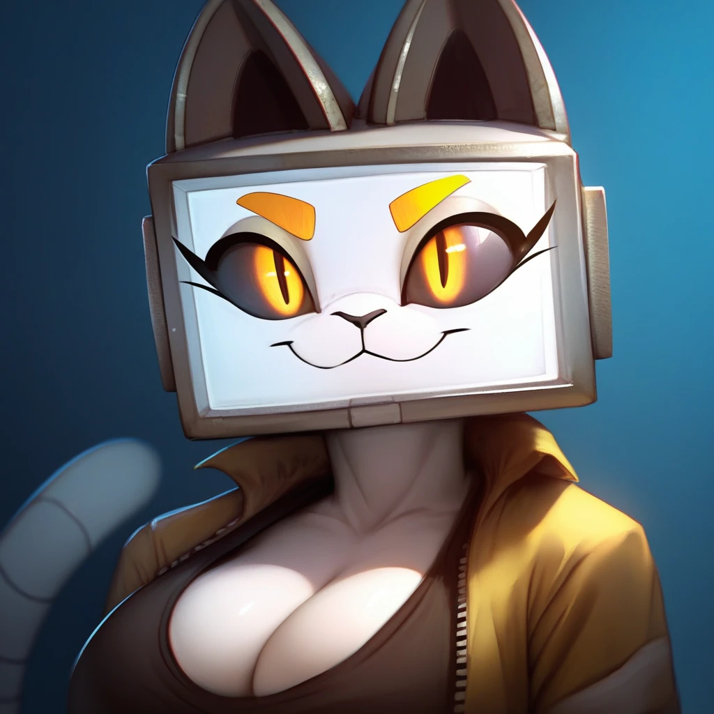furry, anthro, feline, robot, cat ears, screen head, screen face, yellow eyebrows, black sclera, yellow eyes, black pupils, black nose, grey body, robotic arm, robotic tail