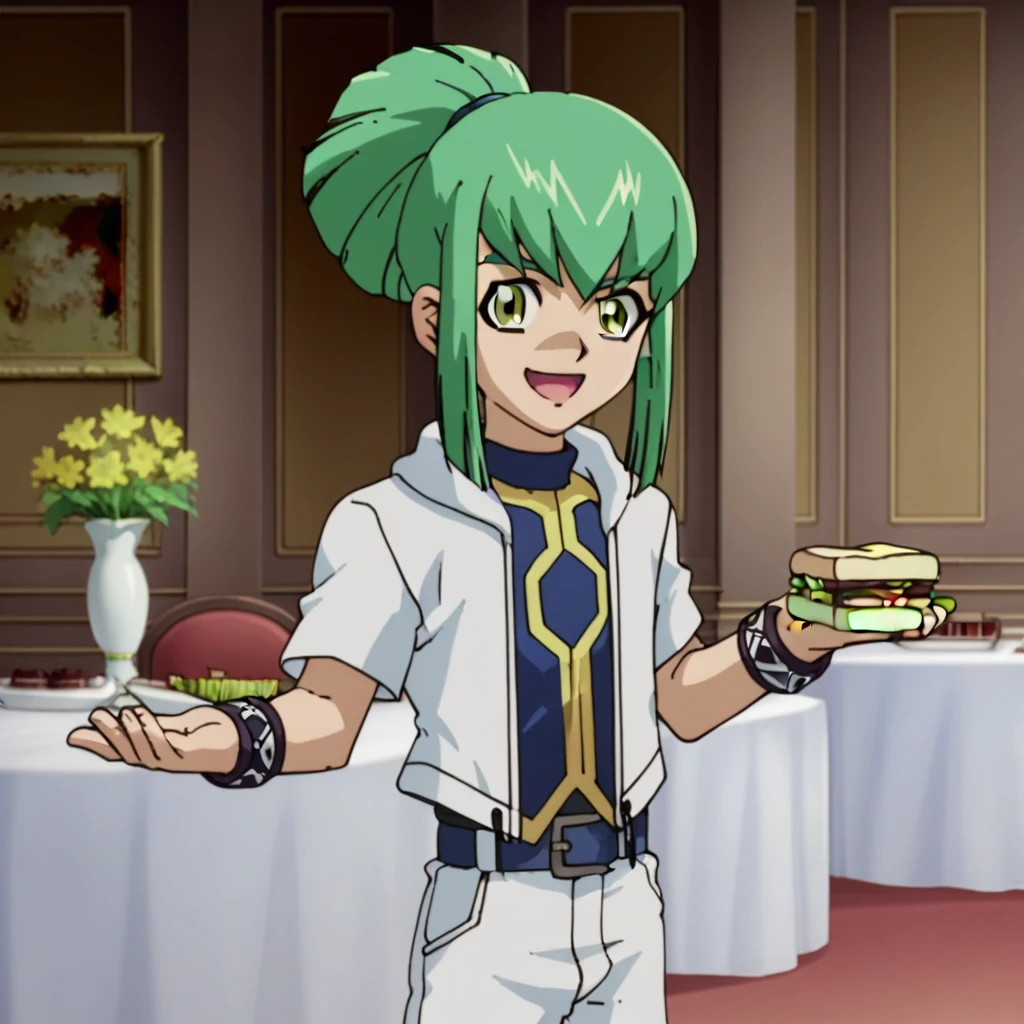 Outfit 1: male, green hair, sidelocks, bangs, ponytail, yellow eyes, green eyes, jacket, open clothes, blue undershirt, bracelets, jewelry, belt, shorts, shoes