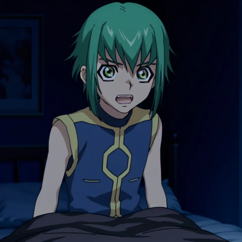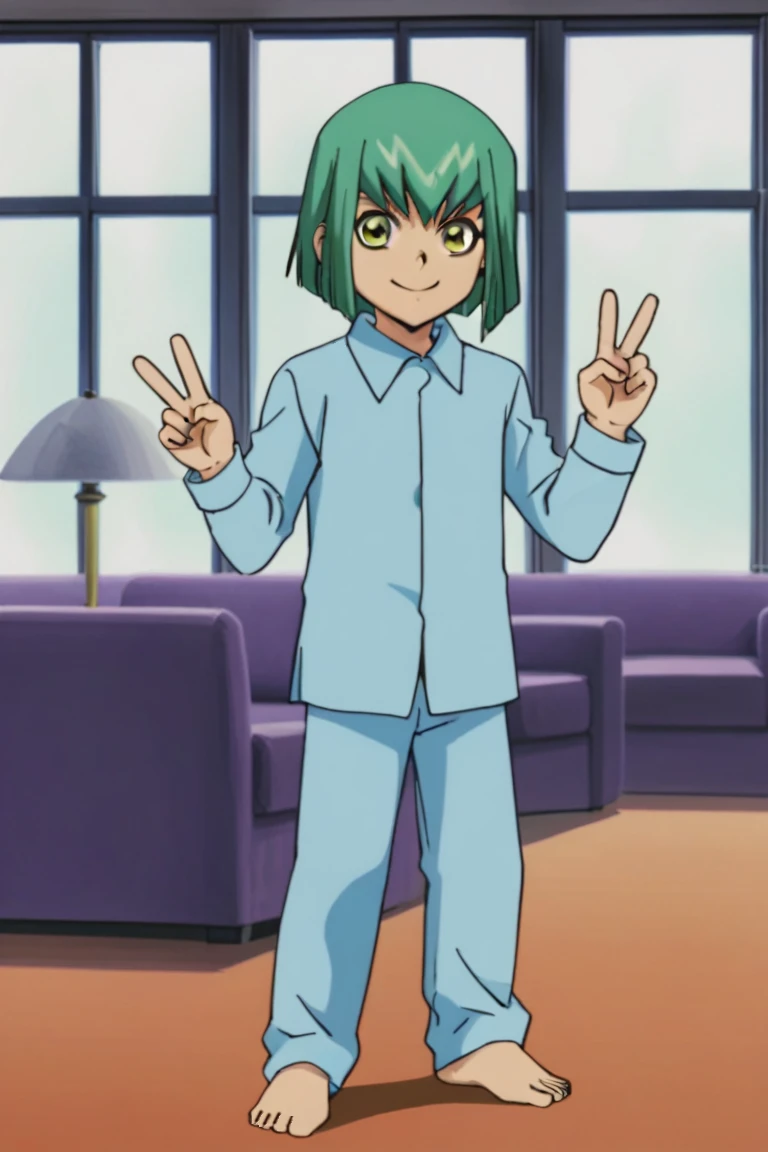 Outfit 2: male, green hair, bob cut, yellow eyes, green eyes, pajamas, pajama shirt, pajama pants, barefoot