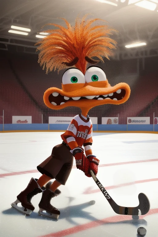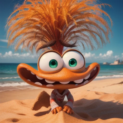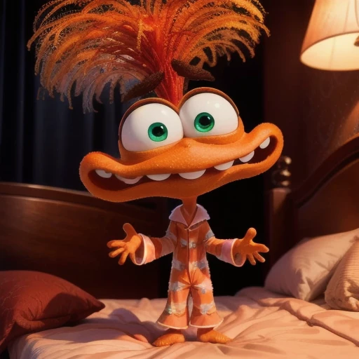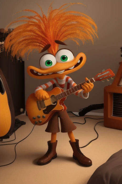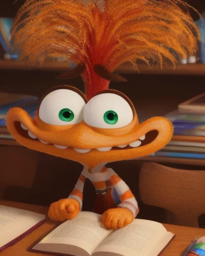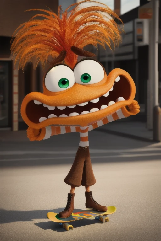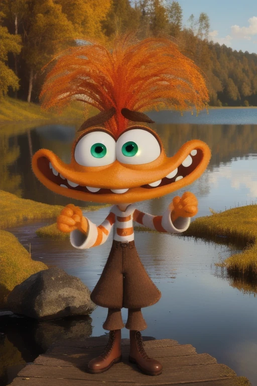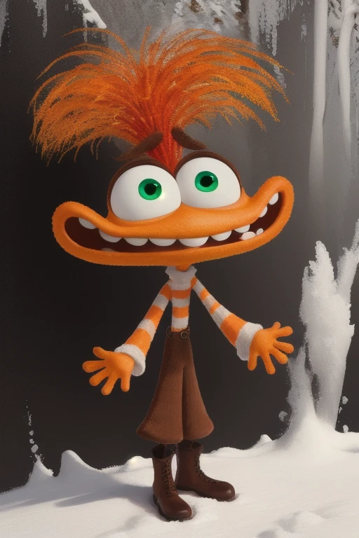 Recommend prompt: "Anxiety InsideOut, 1Monster, orange skin, orange-red hair, big eyes, green eyes, wide mouth, exaggerated eyebrows, neat teeth, wide face, slender figure, exaggerated expression, detailed face, furry, brown pants, brown boots, striped shirt, solo,"