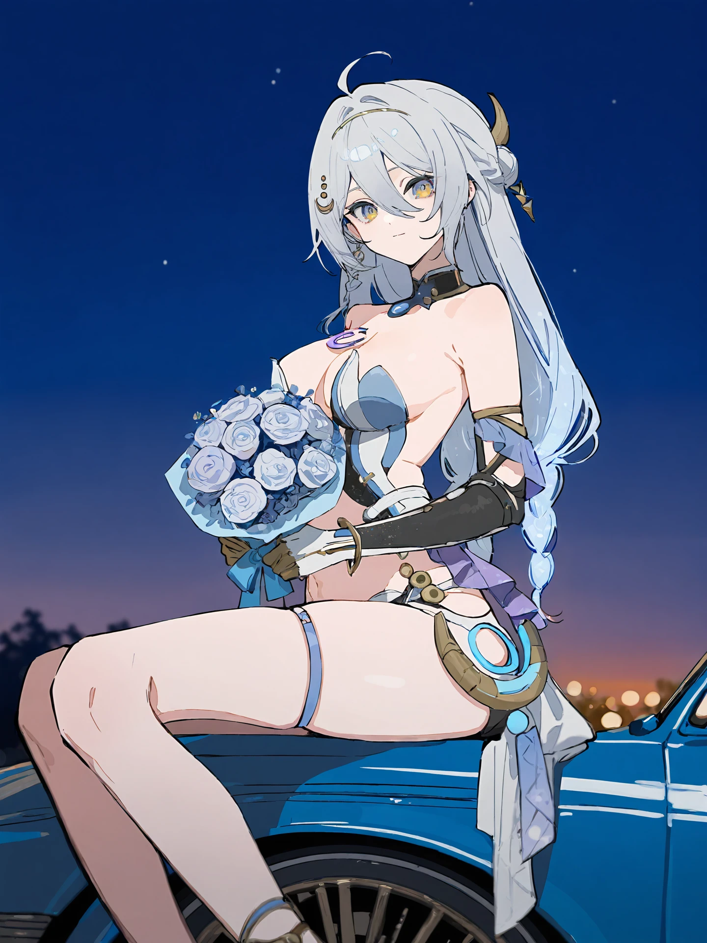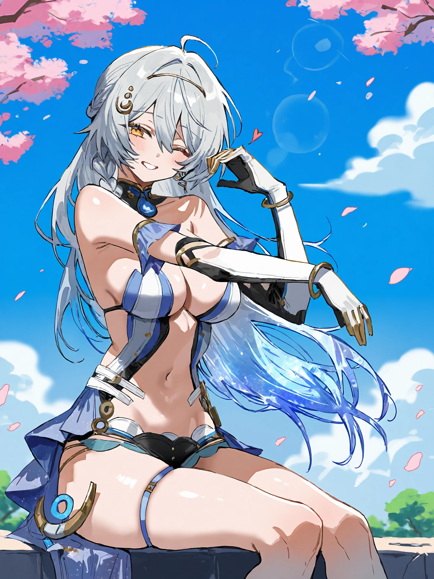 提示词:Acacia, Acacia-Chrono Echo_(Burst), yellow eyes, white hair, multicolored hair, blue hair, hair ornament, ahoge,