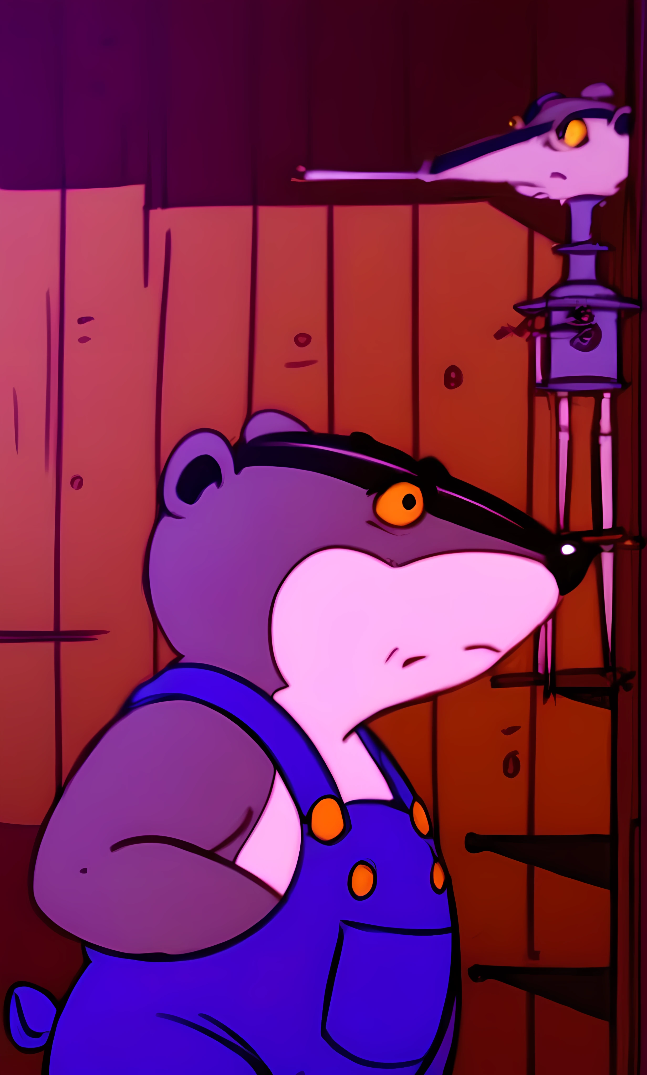 For Dennis the Badger: a badger in blue overalls, smile expression, etc etc,