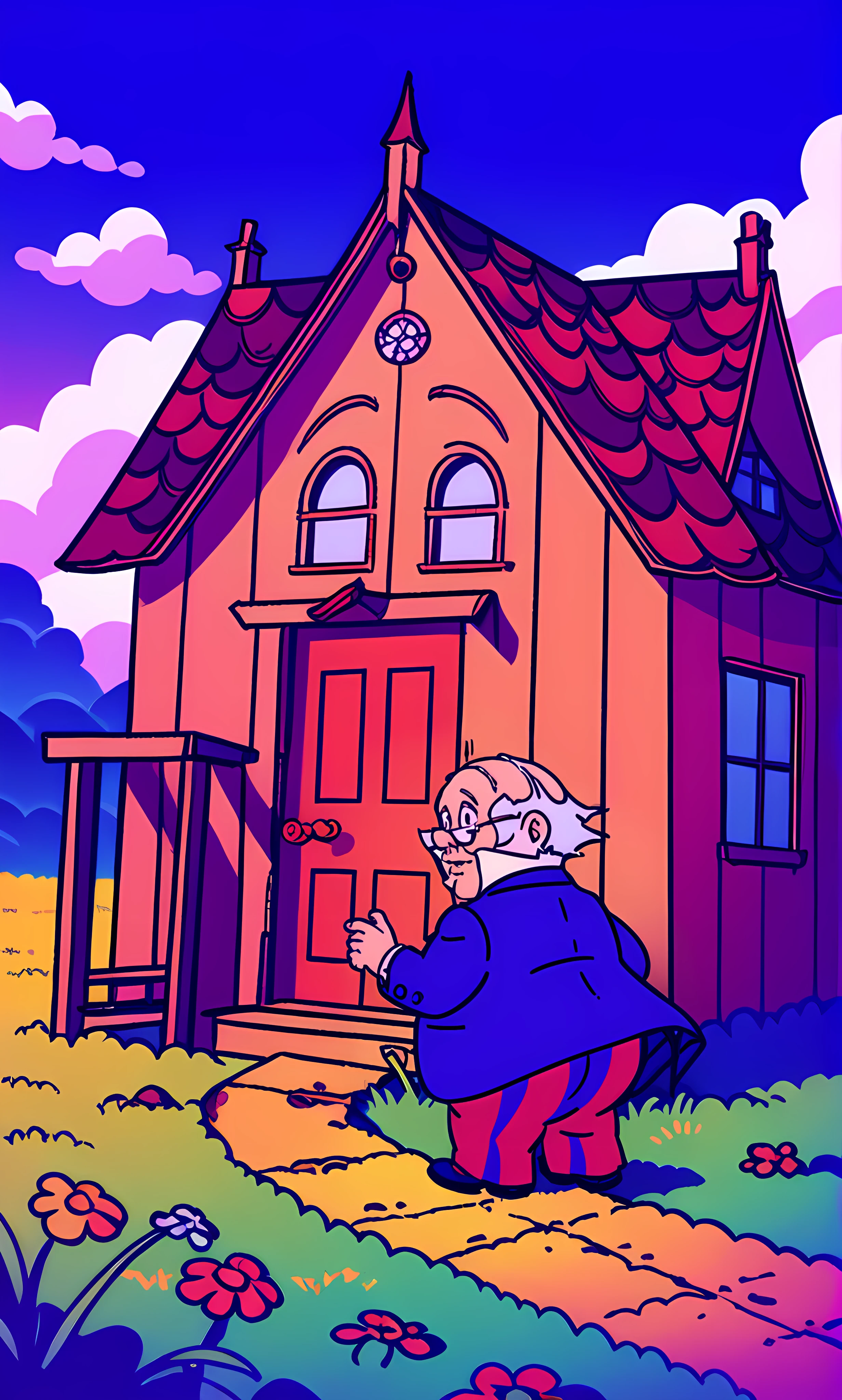 For the Doctor: 'Elderly male, plump, grey hair, balding, glasses, smile expression, bowtie, red vest, blue jacket with white collar, grey pants with red stripes'