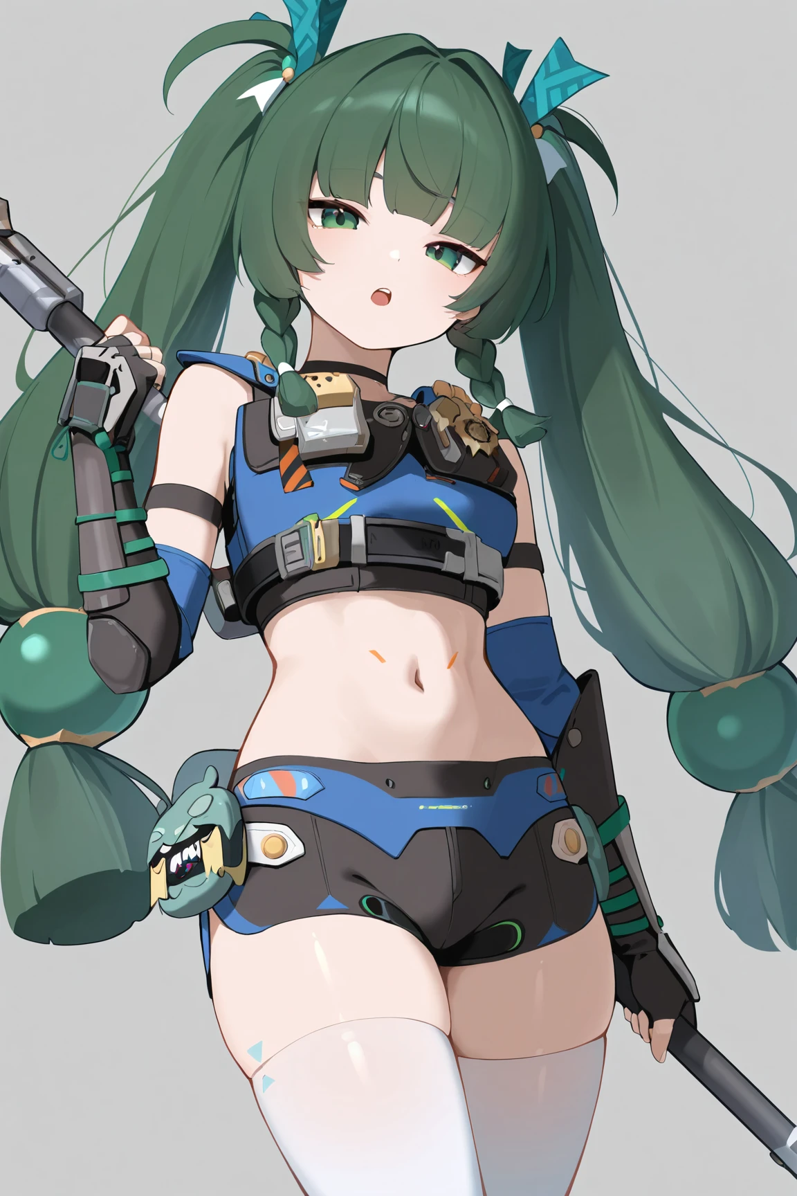 qingyi \(zenless zone zero\), 1girl, solo, green eyes, green hair, gloves, shorts, braid, long hair, navel, polearm, hair ornament, twin braids, thighhighs, looking at viewer, very long hair, fingerless gloves, black gloves, twintails, grey background, midriff, crop top, elbow gloves, black shorts, white thighhighs, short shorts,