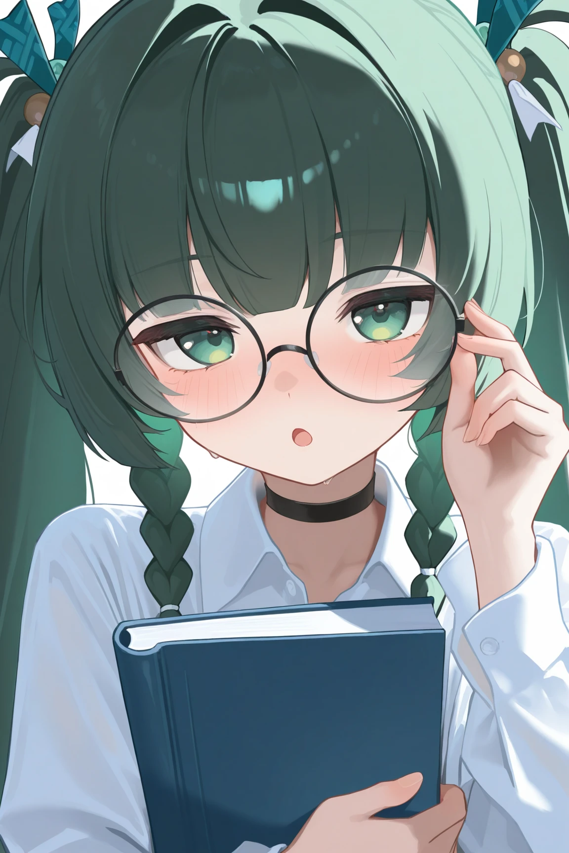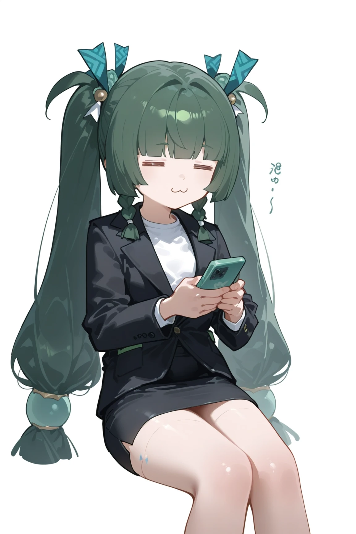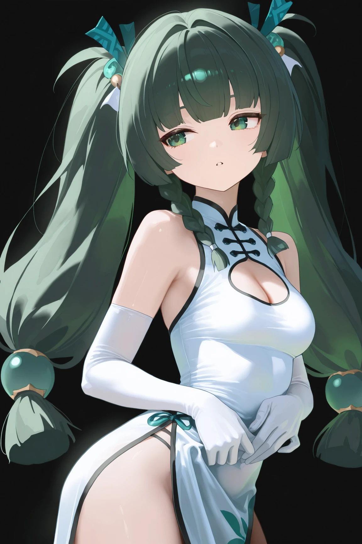 qingyi \(zenless zone zero\), 1girl, solo, green hair, twintails, crop top, very long hair, twin braids, hair ornament, shorts, long hair, green eyes,blue shirt,