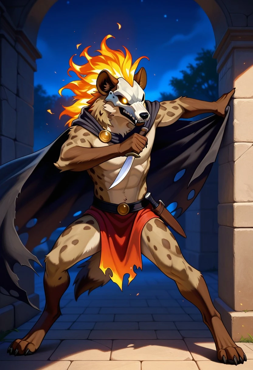 Forsburn: forsburn, hyena, brown fur, firey mane, glowing eyes, skull mask