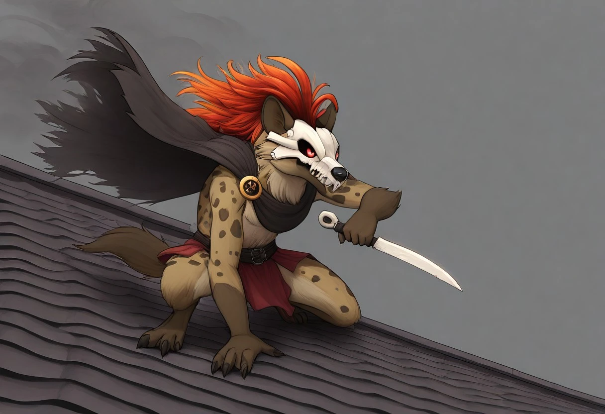 forsburn, hyena, brown fur, spotted fur, orange mane, black scelra, red eyes, skull mask, rivals2