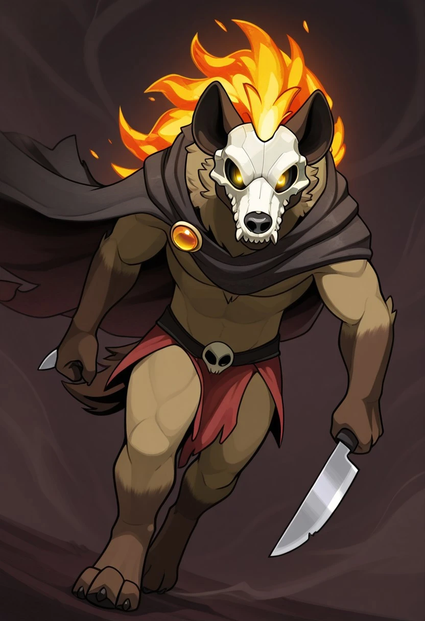 forsburn, hyena, brown fur, firey mane, glowing eyes, yellow eyes, black sclera, skull mask, rivals1