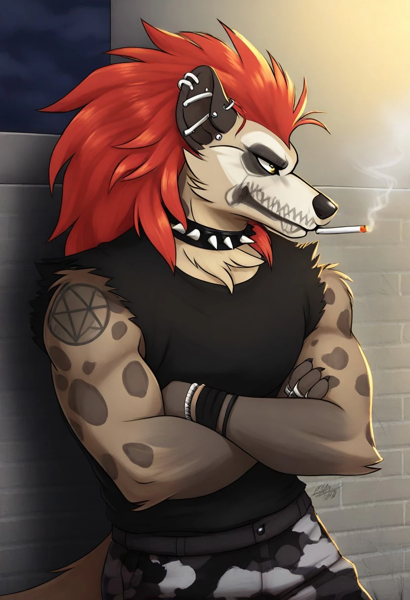 Lovers: forsburnLovers, hyena, brown fur, spotted fur, red hair, face paint, skull, male, yellow eyes, pentagram tattoo